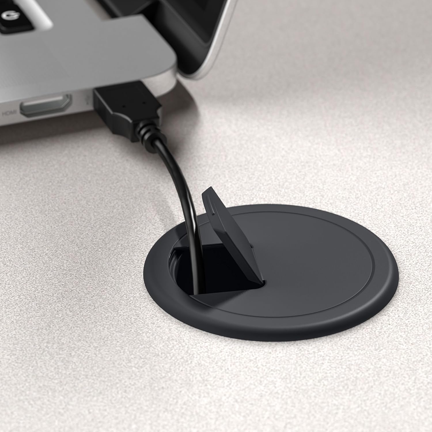 - PRACTICAL FEATURES: A centered wire management grommet keeps your work surface free from awkward and unsightly cords and cables. Adjustable levelers compensate for uneven flooring, and a finished back allows the pc desk to look great facing any direction.