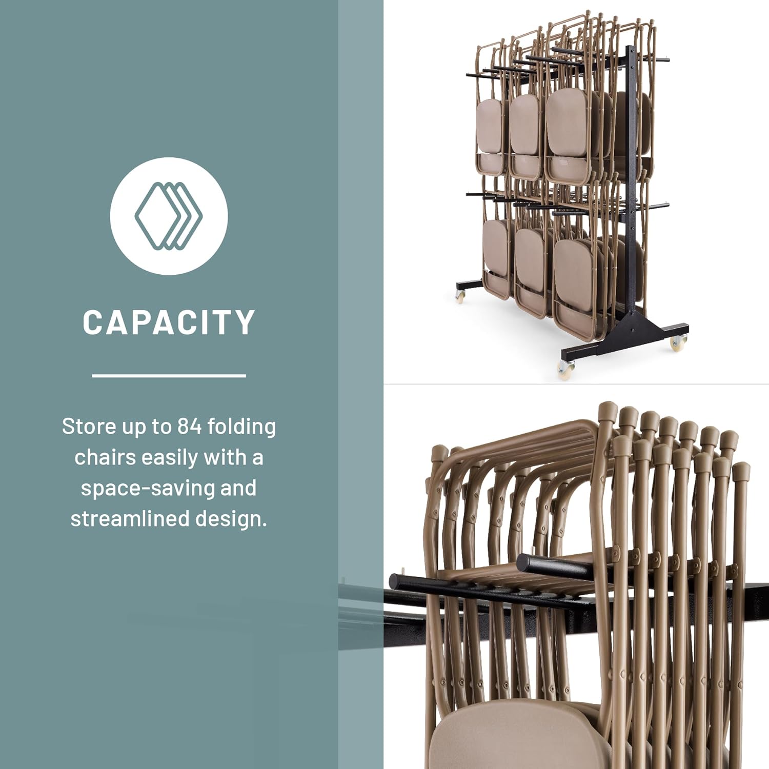 - High-Capacity Storage: Containing two racks, this cart accommodates up to 84 folding metal chairs (not included); Provides ample storage for large volume office chair stacking and transportation; Overall dimensions: 64.5 x 33.5 x 70.25 inches