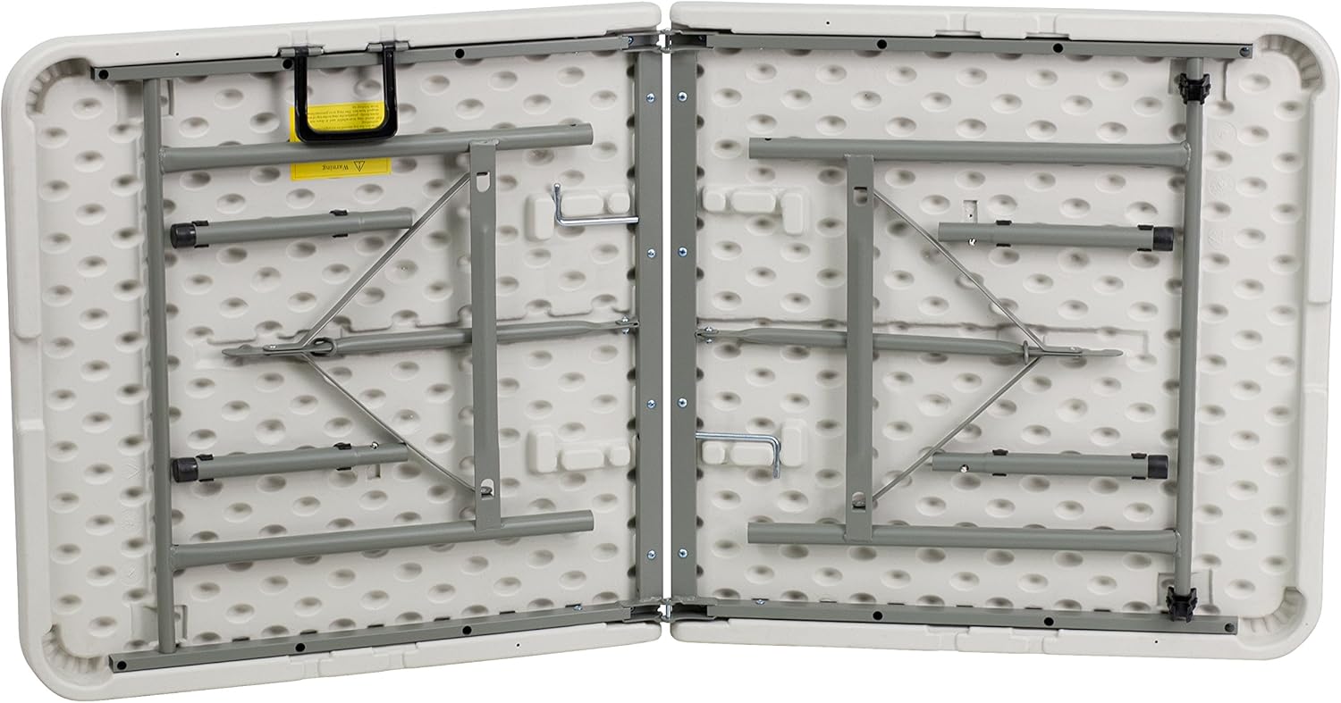 - Ensure you have enough surface space for any function with this ready to use bi-fold folding 5' long rectangular table that seats up to six adults. The legs fold under the table for storage while the attached carrying handle provides portability