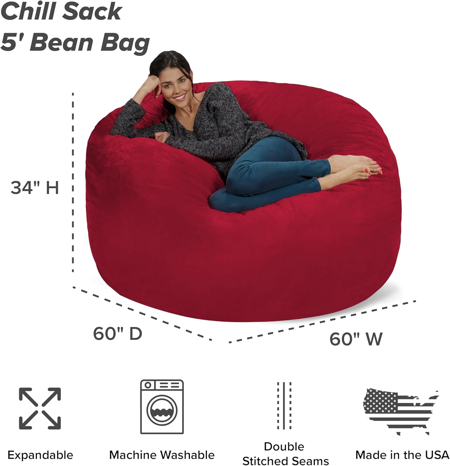 Chill Sack Bean Bag Chair - 5' Giant Memory Foam Lounge Chair with Soft Microfiber Cover – Cozy Furniture for Living Room, Dorm, & Kids' Rooms – Comfortable 5 Ft, Microsuede Lounge Sofa, Cinnabar