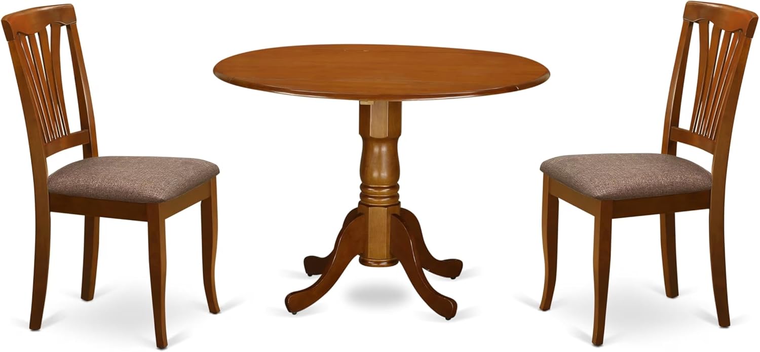 East West Furniture DLAV3-SBR-C 3 Piece Dining Room Table Set Contains a Round Dining Table with Dropleaf and 2 Linen Fabric Upholstered Chairs, 42x42 Inch, Saddle Brown