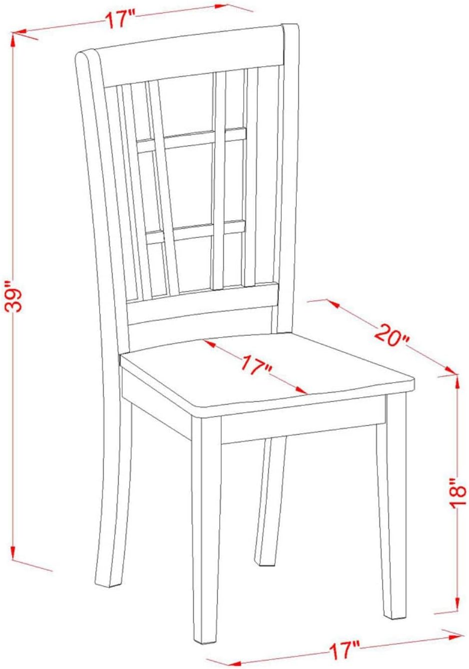 - PRODUCT DIMENSION: The Dining Table Dimension: Length: 42; Width: 42; Height: 29.5. The Dimension of the Kitchen Chair: Length: 20; Width: 17; Height: 39.