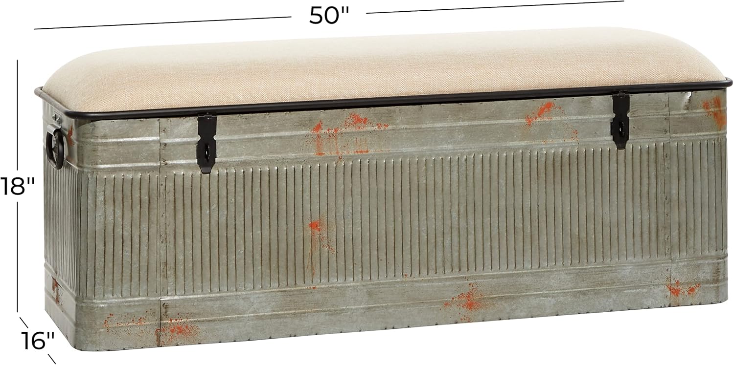 Deco 79 Metal Room Storage Bench Galvanized Entryway Bench with Cream Burlap Top, Bench 50" x 16" x 18", Gray