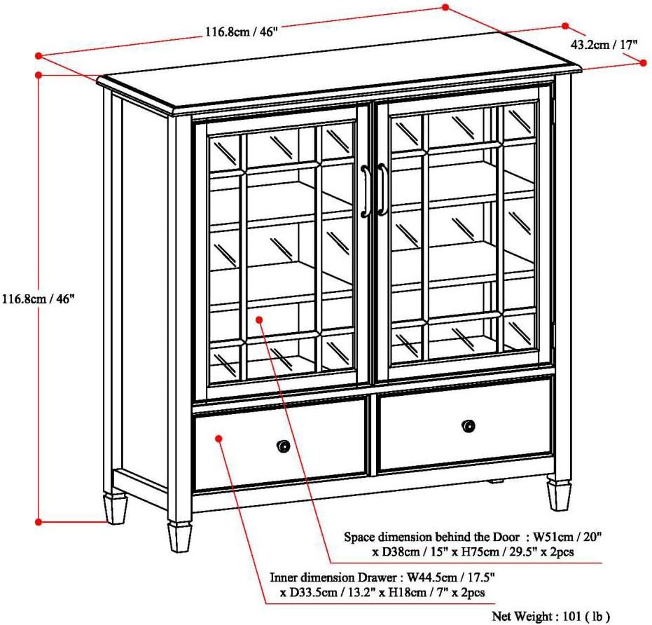 - Features 2 tempered glass doors that open to a cabinet with 4 adjustable shelves and 2 deep drawers.