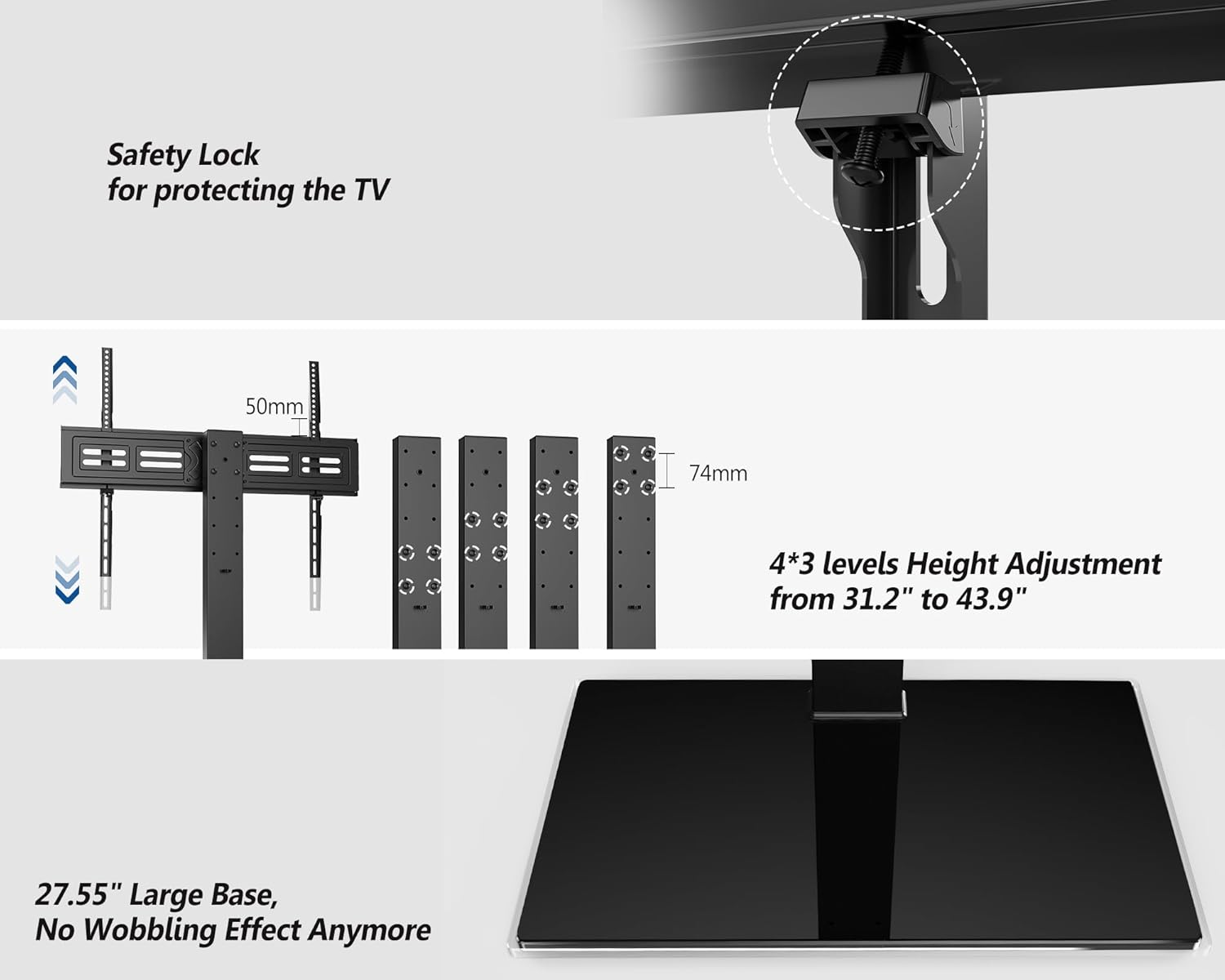 - TV STAND: Universal TV stand/base tabletop stand to mount your TV and AV components on an entertainment center or a desk/table. 10 mm thick sleek tempered glass shelf can store your cable tv box, satellite receiver, gaming consoles and compatible with PS4, Xbox, or Apple TV