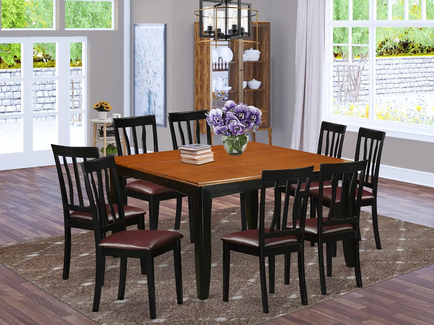 East West Furniture PFAN9-BCH-LC 9 Piece Dining Room Table Set Includes a Square Kitchen Table with Butterfly Leaf and 8 Faux Leather Upholstered Dining Chairs, 54x54 Inch, Black & Cherry