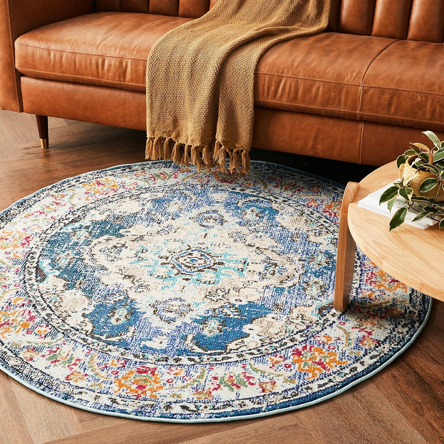 SAFAVIEH Monaco Collection Area Rug - 5' Round, Navy & Light Blue, Boho Chic Medallion Distressed Design, Non-Shedding & Easy Care, Ideal for High Traffic Areas in Living Room, Bedroom (MNC243N)