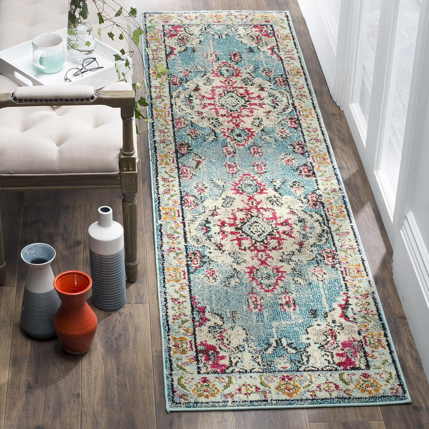 SAFAVIEH Monaco Collection Runner Rug - 2'2" x 6', Light Blue & Fuchsia, Boho Chic Medallion Distressed Design, Non-Shedding & Easy Care, Ideal for High Traffic Areas in Living Room, Bedroom (MNC243J)