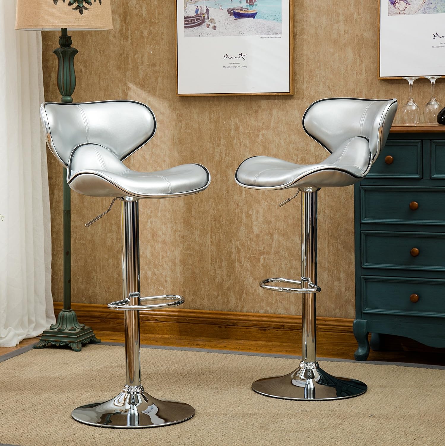 Roundhill Furniture Masaccio Cushioned Leatherette Upholstery Airlift Adjustable Swivel Barstool with Chrome Base, Set of 2, Silver