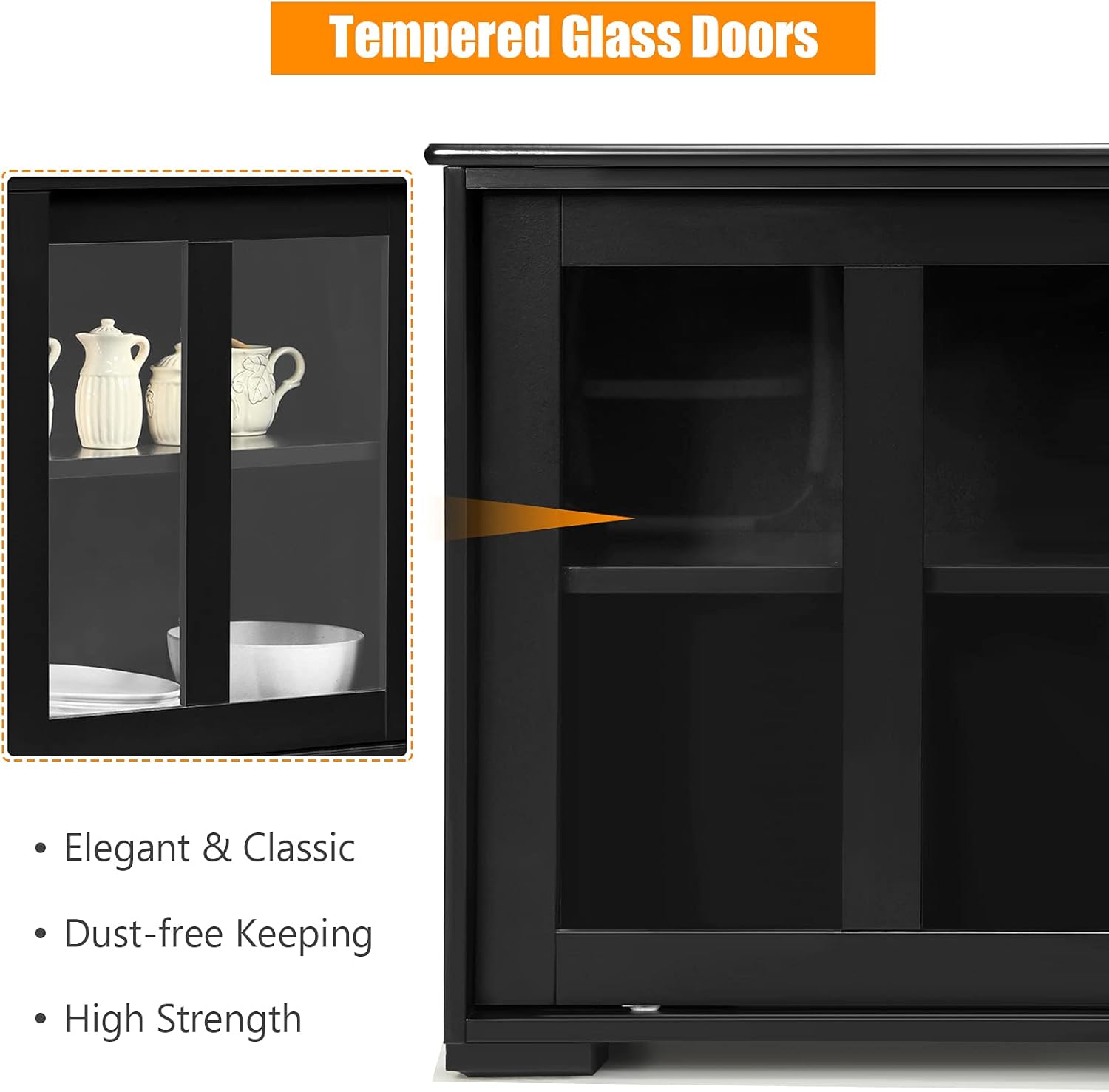 - 【Height-Adjustable Shelf】 - This kitchen cabinet features a height-adjustable storage shelf with 3 height positions, which can manage to make the storage space utilized according to the item size. Plus, with tempered transparent glass doors, you can find your items effortlessly.