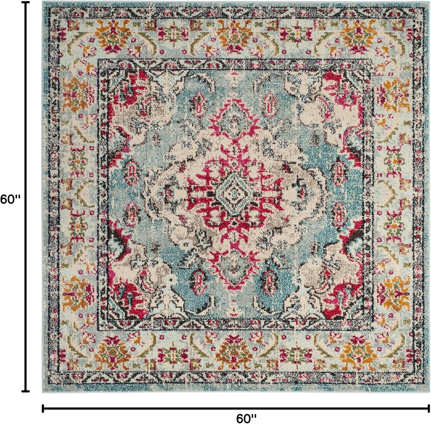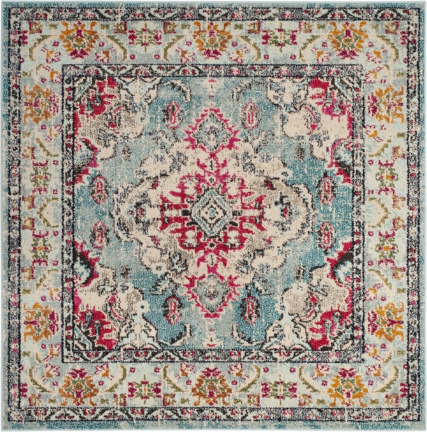 SAFAVIEH Monaco Collection Area Rug - 5' Square, Light Blue & Fuchsia, Boho Chic Medallion Distressed Design, Non-Shedding & Easy Care, Ideal for High Traffic Areas in Living Room, Bedroom (MNC243J)