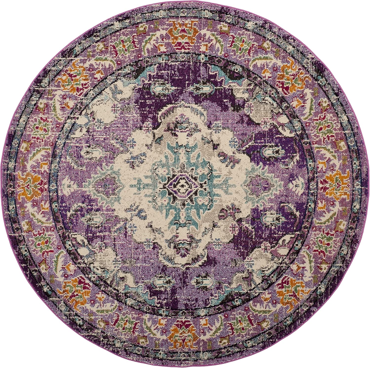 SAFAVIEH Monaco Collection Area Rug - 6'7" Round, Violet & Light Blue, Boho Chic Medallion Distressed Design, Non-Shedding & Easy Care, Ideal for High Traffic Areas in Living Room, Bedroom (MNC243L)
