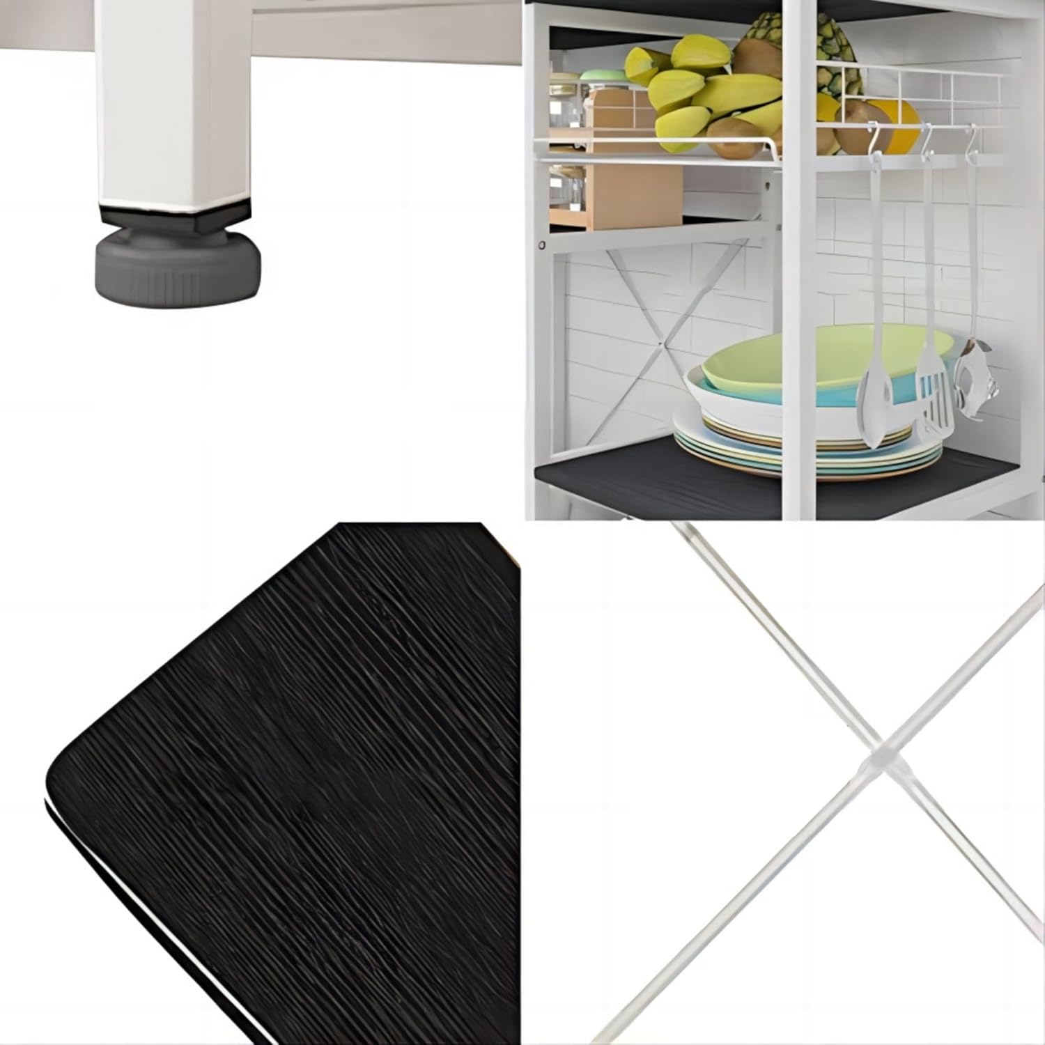 - 【Durable & Stable】: Made of thickened laminated wood panel with high glossy finish, waterproof, anti-scratch and easy to clean.Heavy duty powder-coated metal materials, which ensures stability and durability.X frame design adds more stability and durability of the kitchen cart.