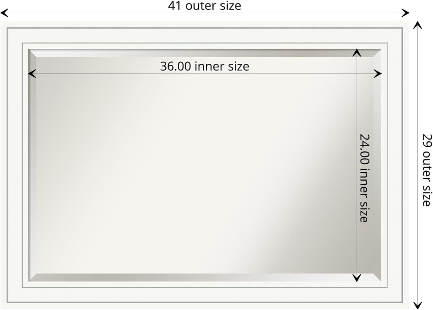 - MIRROR DETAILS: This mirror features premium glass for a clear, undistorted image and is finished with a beveled edge to give the glass a decorative touch. The overall size of this bathroom mirror measures exactly 41 x 29 inches, including the frame. Its reflective area measures 36 x 24 inches.