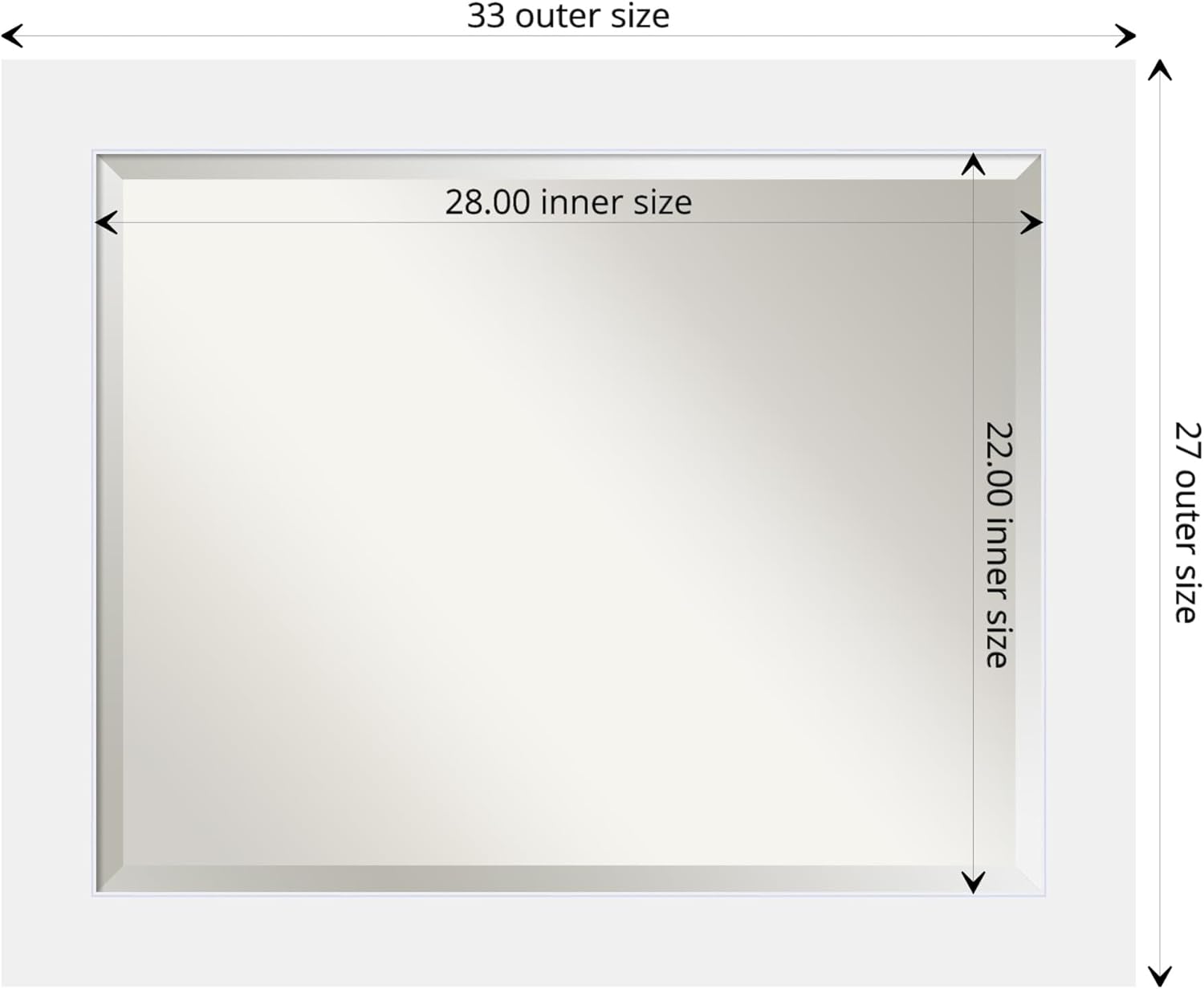 - MIRROR DETAILS: This mirror features premium glass for a clear, undistorted image and is finished with a beveled edge to give the glass a decorative touch. The overall size of this bathroom mirror measures exactly 33 x 27 inches, including the frame. Its reflective area measures 28 x 22 inches.