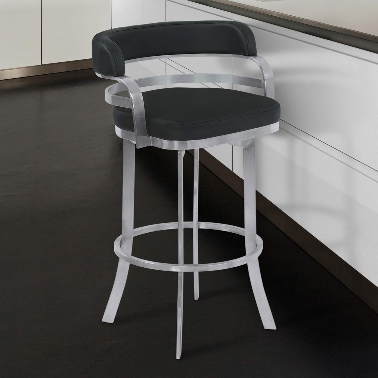 Armen Living Prinz 26" Counter Height Swivel Barstool in Black Faux Leather and Brushed Stainless Steel Finish