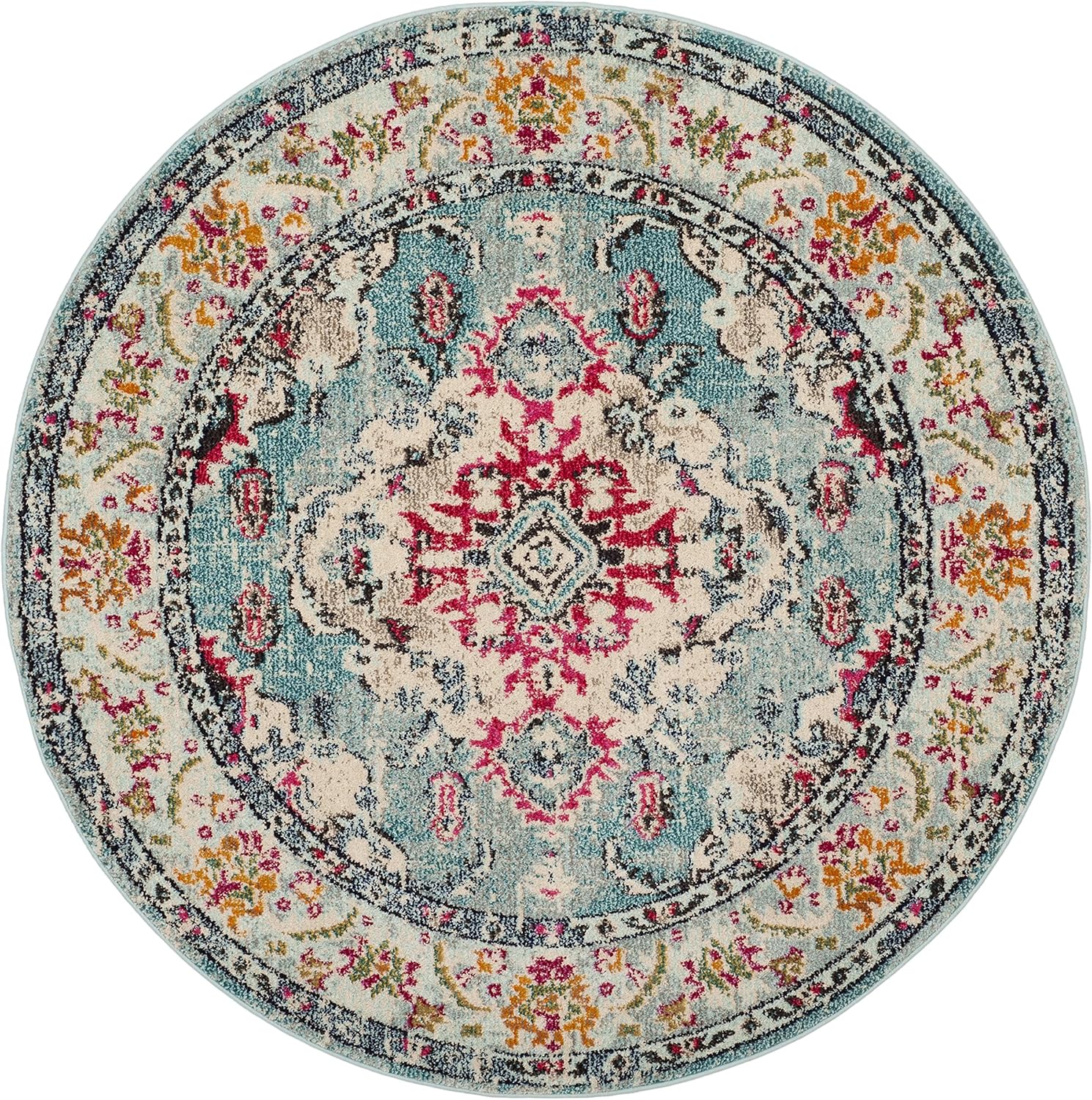 SAFAVIEH Monaco Collection Area Rug - 3' Round, Light Blue & Fuchsia, Boho Chic Medallion Distressed Design, Non-Shedding & Easy Care, Ideal for High Traffic Areas in Living Room, Bedroom (MNC243J)