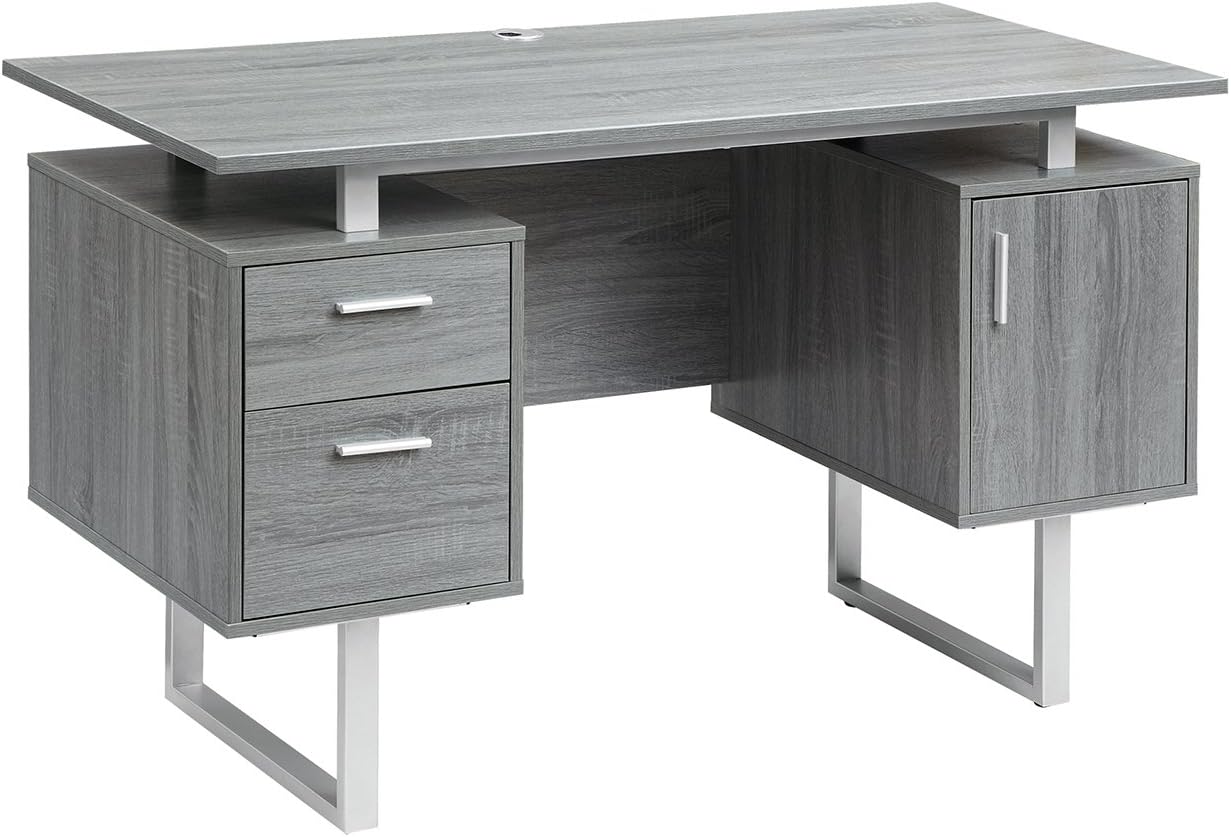 - Large floating top work surface, paired with two sleek silver track metal legs