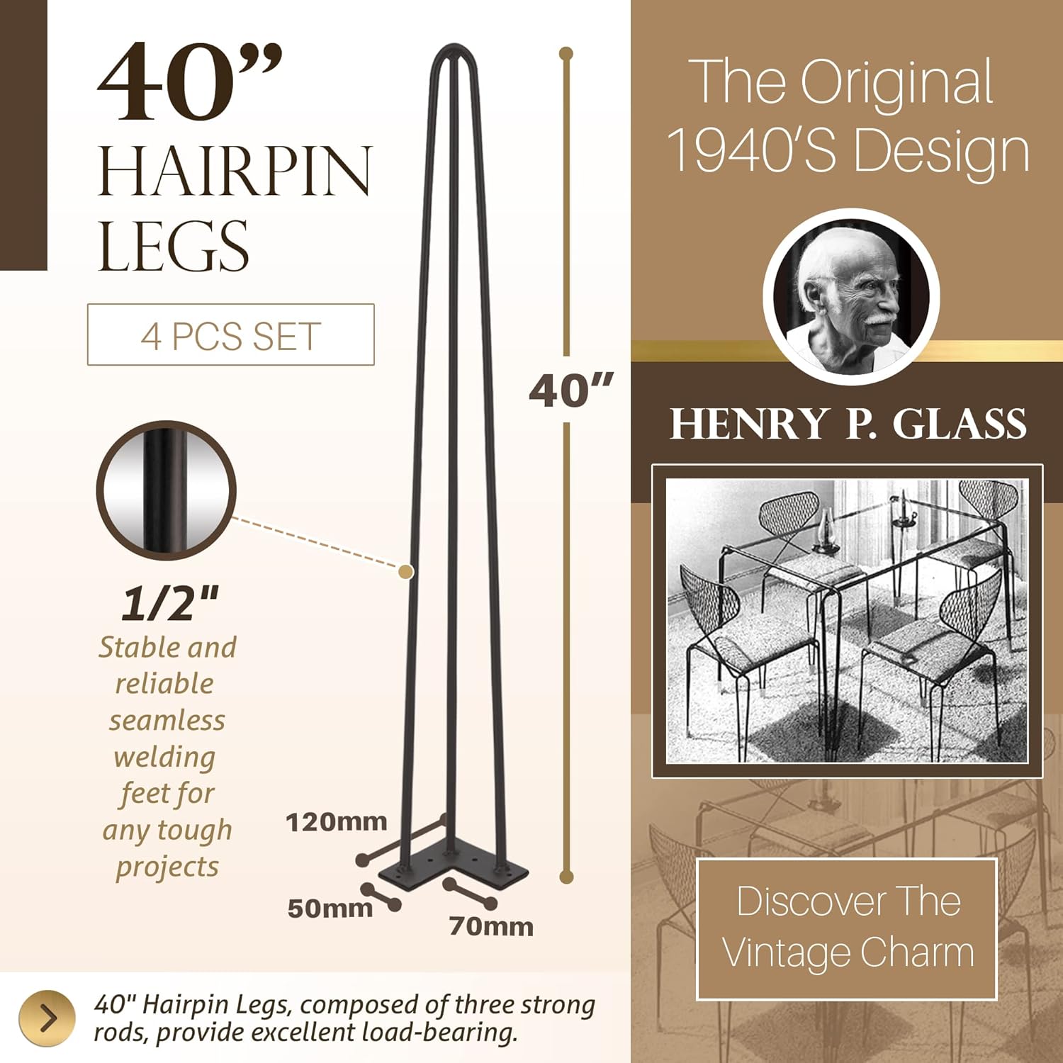 TEN49 Heavy Duty Hairpin Table Legs - 40 Inch Industrial Black Furniture Legs - 1/2" Extra Thickness 3 Solid Rods Metal Table Legs - Fit for Mid-Century Modern Standing Desk, Bar Height Table Legs
