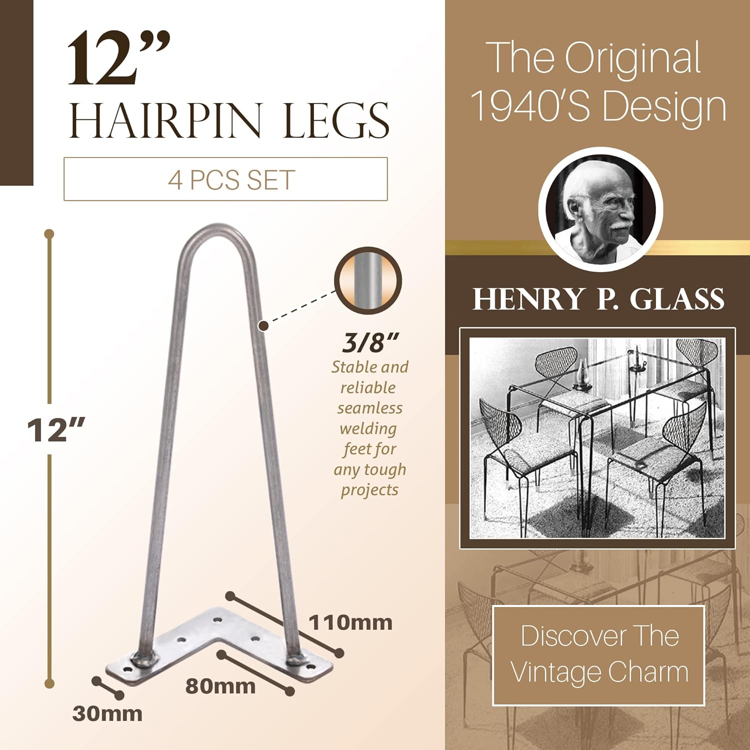TEN49 Heavy Duty Hairpin Table Leg - 12 Inch Industrial Furniture Legs - Raw Steel Color Solid Rods Metal Leg for Table - Fit for Mid-Century Modern Bed End, Coffee Table, TV Stand, Chair Legs