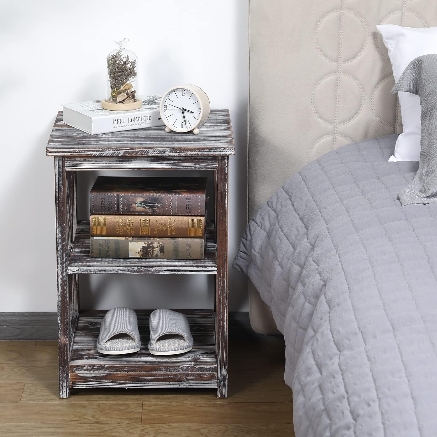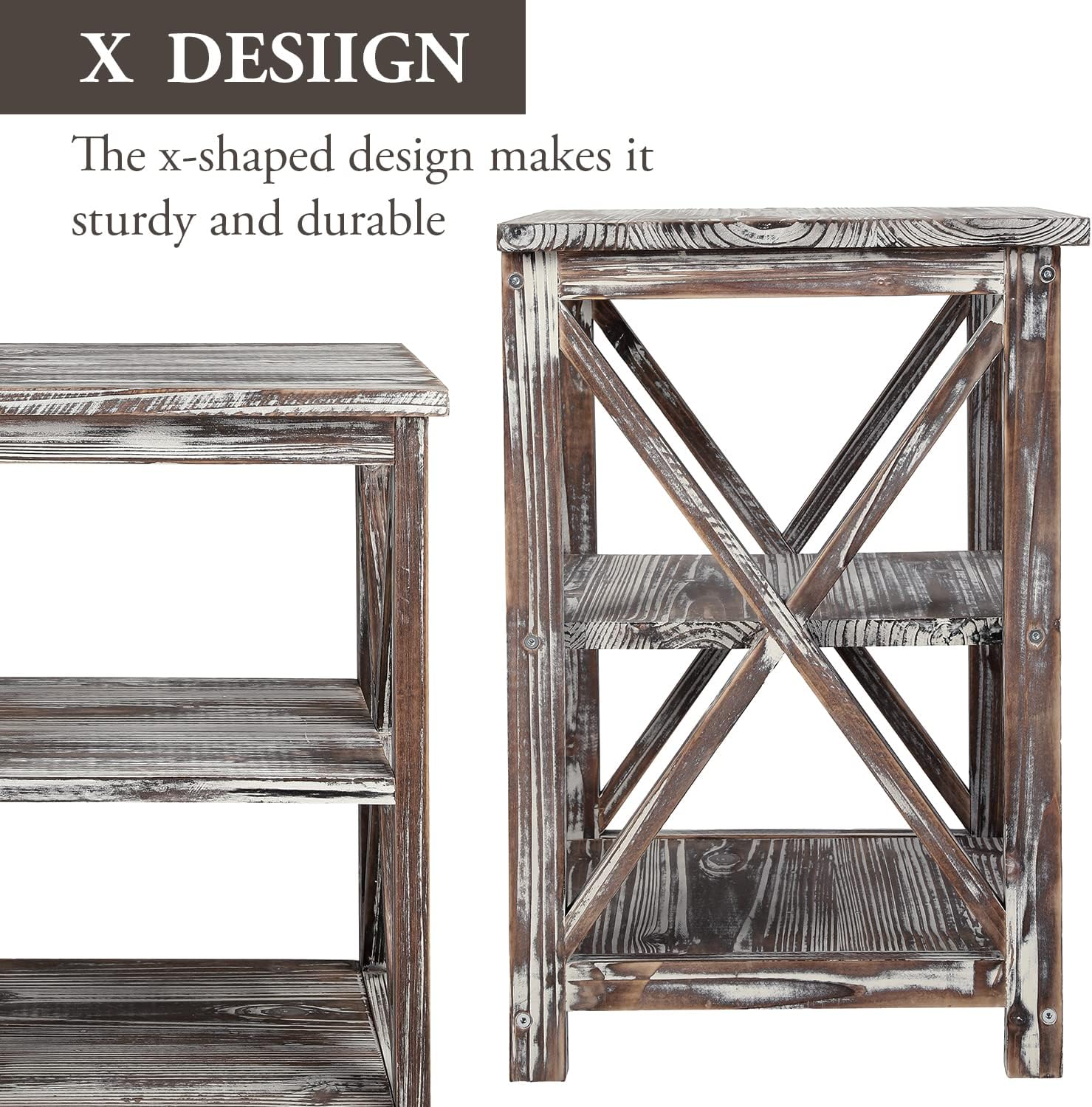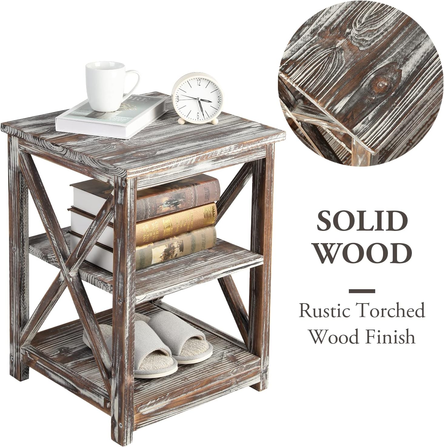 MyGift 24 Inch Tall End Table, Rustic Torched Solid Wood Living Room Accent Side Table with 3 Tier Display Shelf, Wooden X Design Bedroom Nightstand Square Storage Shelves