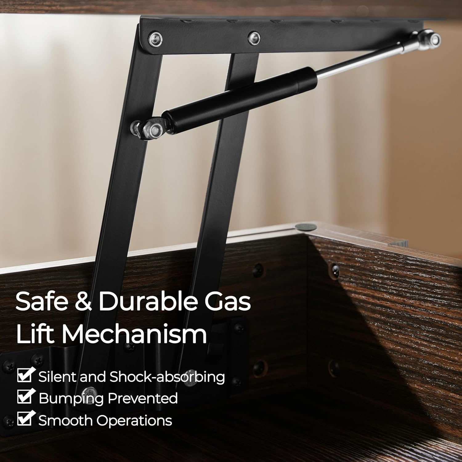 - Functional and Versatile: Sporting a neutral coloring and clean lines, this lift-top table is the piece that can blend harmoniously with most home styles. With this functional living room furniture, you don’t need to bend over to work or dine on the table while relaxing on the couch