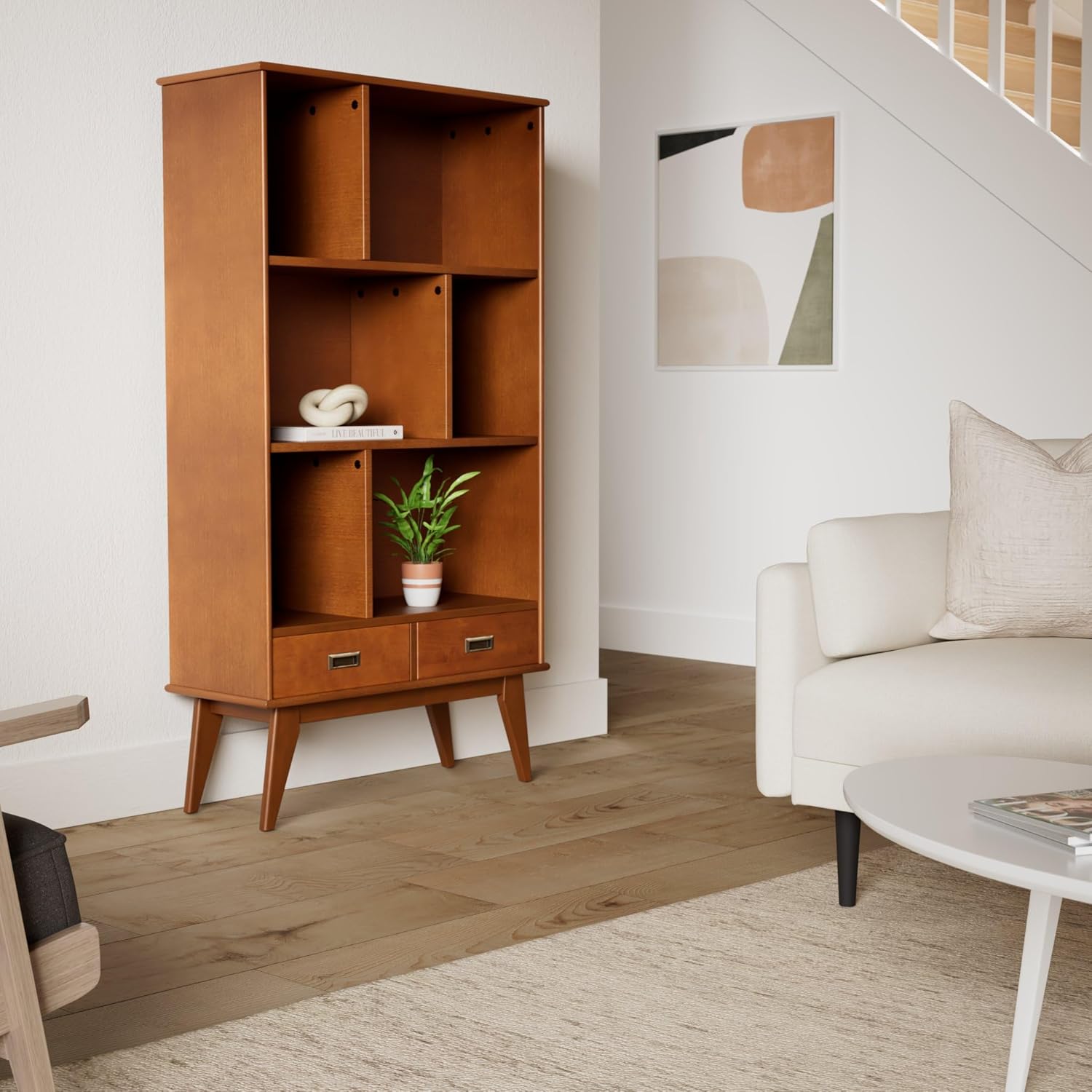 SIMPLIHOME Draper Bookcase - 64 inch Tall Solid Hardwood Wide Storage Bookshelf in Teak Brown, Mid-Century Modern Storage for Living Room, Study Room or Office with Adjustable Shelves and Tapered Legs