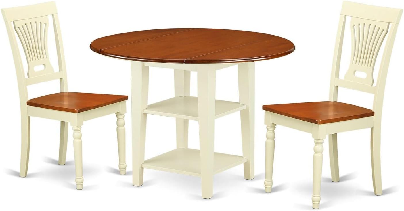 East West Furniture SUPL3-BMK-W 3 Piece Kitchen Table & Chairs Set Contains a Round Dining Room Table with Dropleaf & Shelves and 2 Solid Wood Seat Chairs, 42x42 Inch, Buttermilk & Cherry