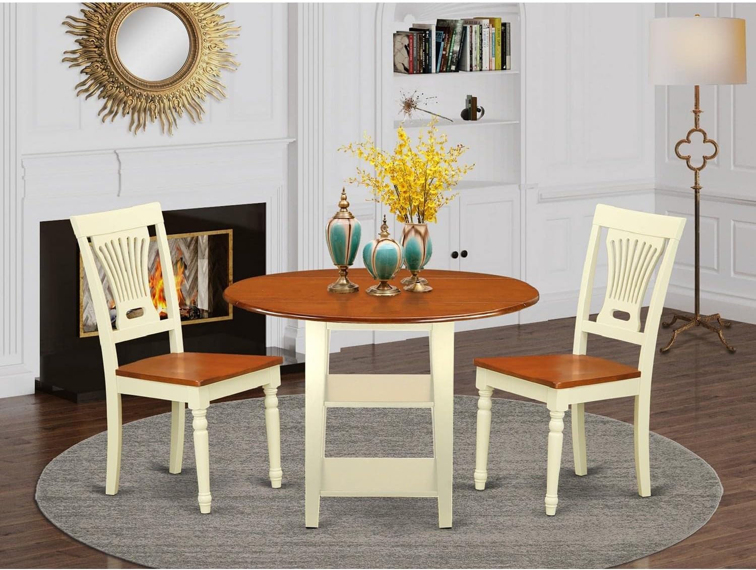 - DINING TABLE SET FINISH: Our Drop Leaf Round dining table boasts a cherry tabletop and Buttermilk legs. Similarly, the dining room chairs feature cherry seats and Buttermilk legs, offering a stylish twist on traditional chairs. These kitchen chairs are expertly designed to match any decor seamlessly, with available colors that add a touch of sophistication.