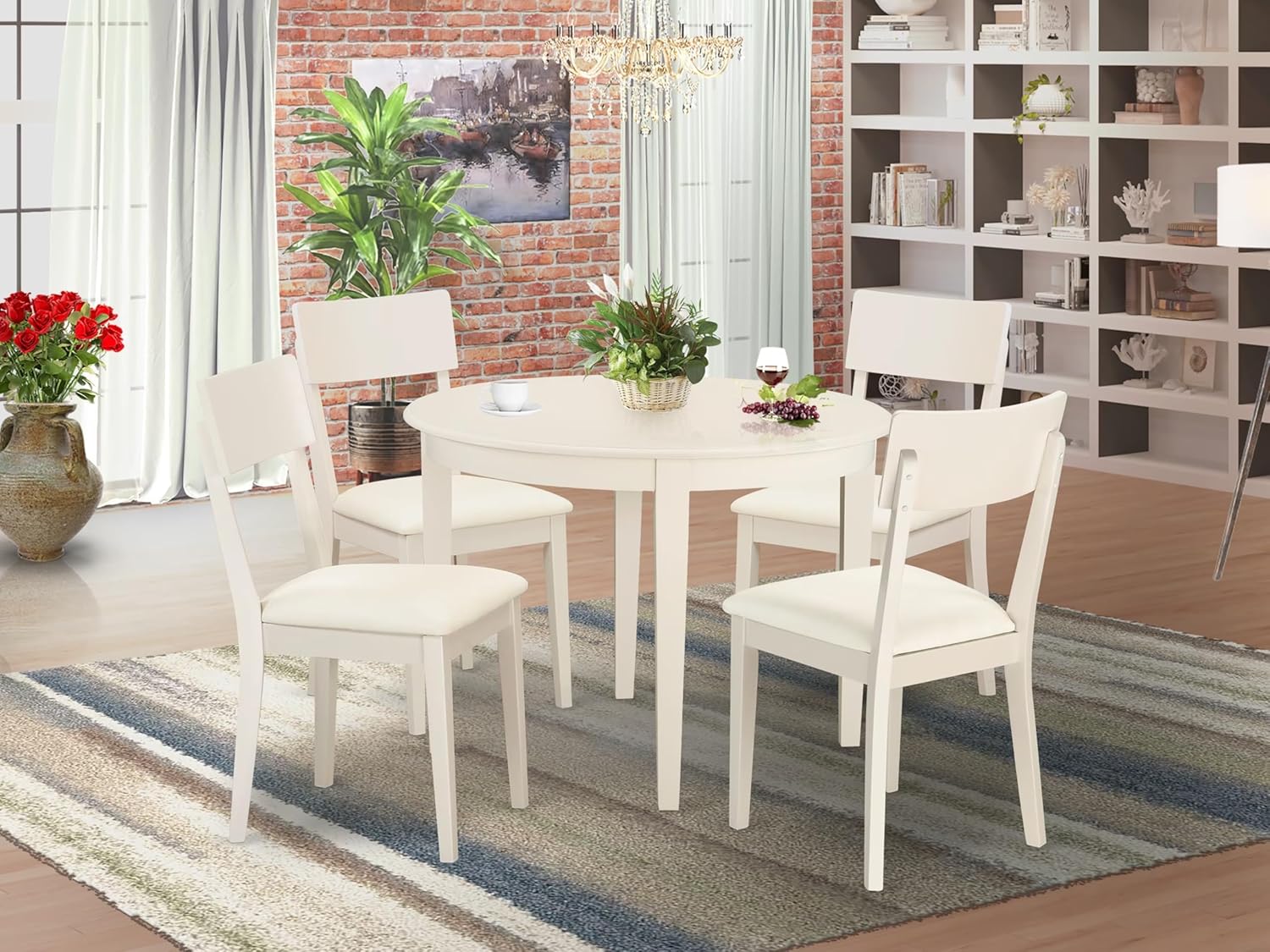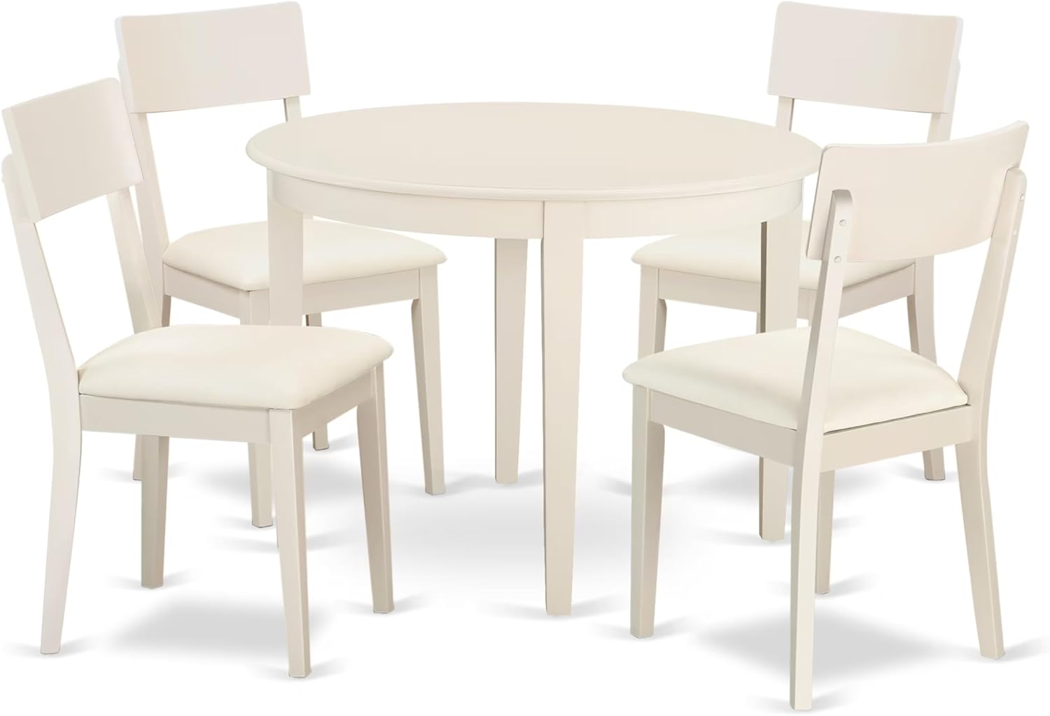 East West Furniture BOAD5-LWH-LC 5 Piece Dining Room Furniture Set Includes a Round Kitchen Table and 4 Faux Leather Upholstered Dining Chairs, 42x42 Inch, Linen White