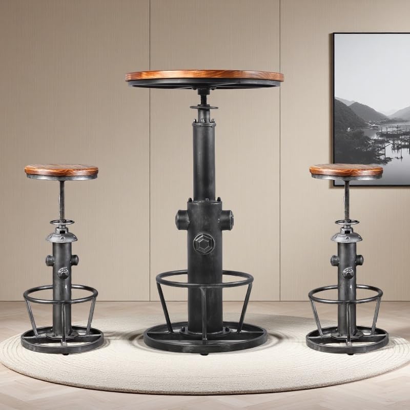 Swivel Bar Stool Industrial Coffee Kitchen Dining Chair Fire Hydrant Design Height Adjustable 24.8-30.7inch Wooden Seat