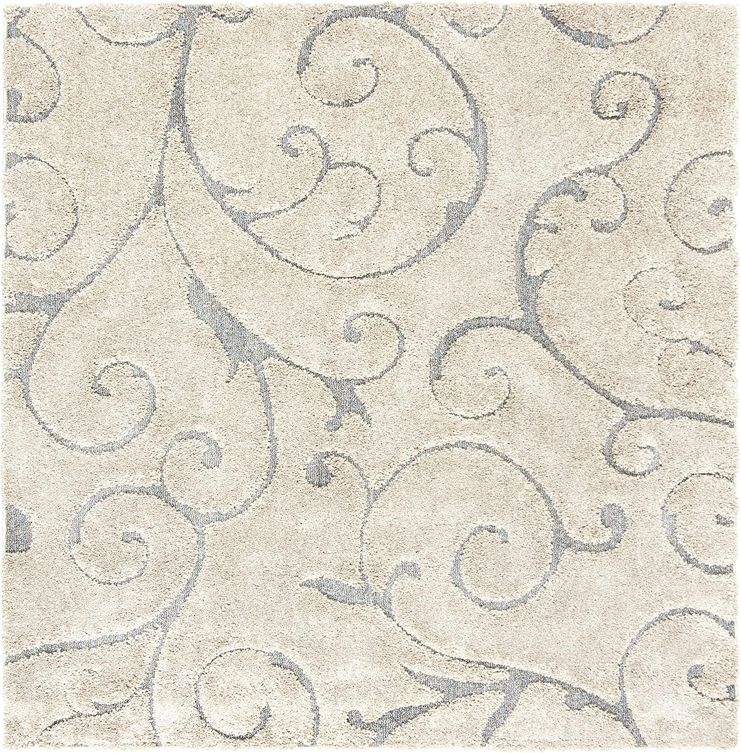 SAFAVIEH Florida Shag Collection Area Rug - 6'7" Square, Beige & Blue Grey, Scroll Design, Non-Shedding & Easy Care, 1.2-inch Thick Ideal for High Traffic Areas in Living Room, Bedroom (SG455-1155)