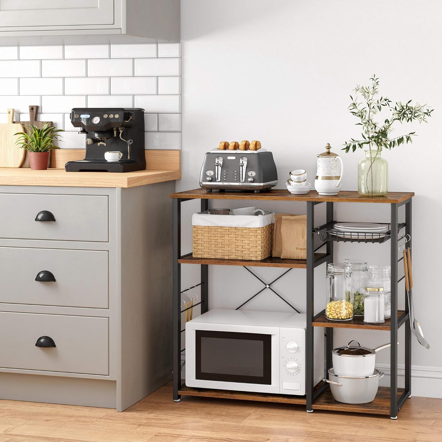 VASAGLE ALINRU Kitchen Baker’s Rack, Coffee Bar, Microwave Oven Stand, with Steel Frame, Wire Basket, 6 Hooks, 35.4", Rustic Brown
