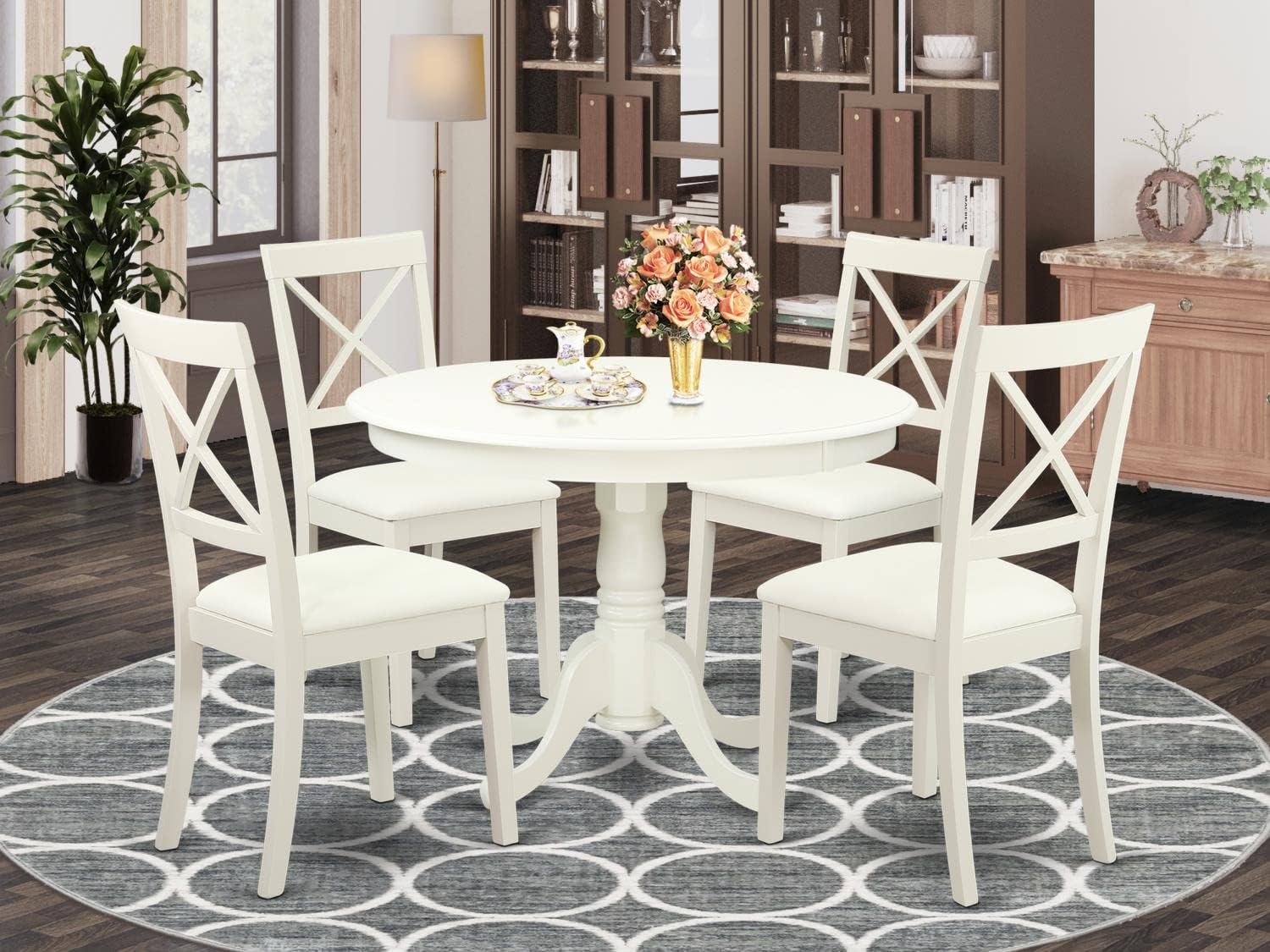 - WOOD TABLE SET FINISH: The modern dining table set is finished in Linen White, giving it a luxurious and retro look. The wooden dining chairs and pedestal table exude elegance. The set features comfortable Linen Faux Leather seats, solid wood legs, and X-back kitchen chairs. It's ergonomically designed to fit your body shape, promoting air circulation and offering a cozy seating experience.