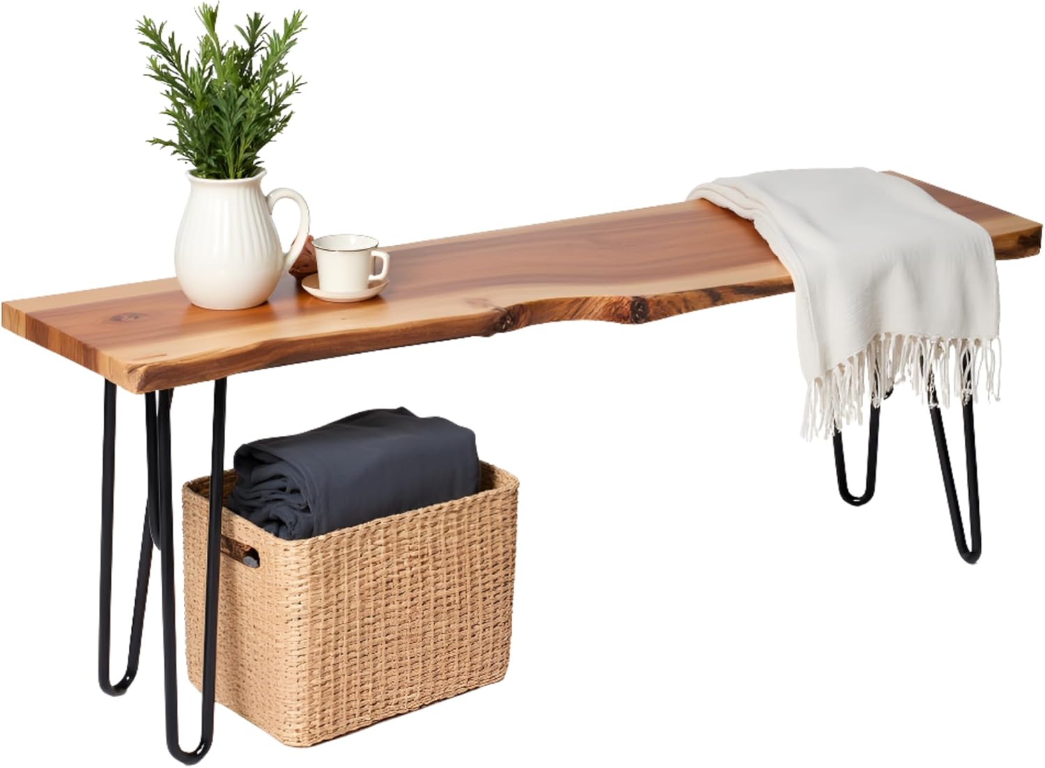 - 48-INCH LIVE EDGE BENCH – Crafted from solid Acacia wood with a natural live edge tabletop and metal hairpin legs, this bench blends rustic farmhouse charm with modern industrial style. Each piece is one-of-a-kind, featuring natural grain, knots, and color variations for a distinctive, artisanal look.