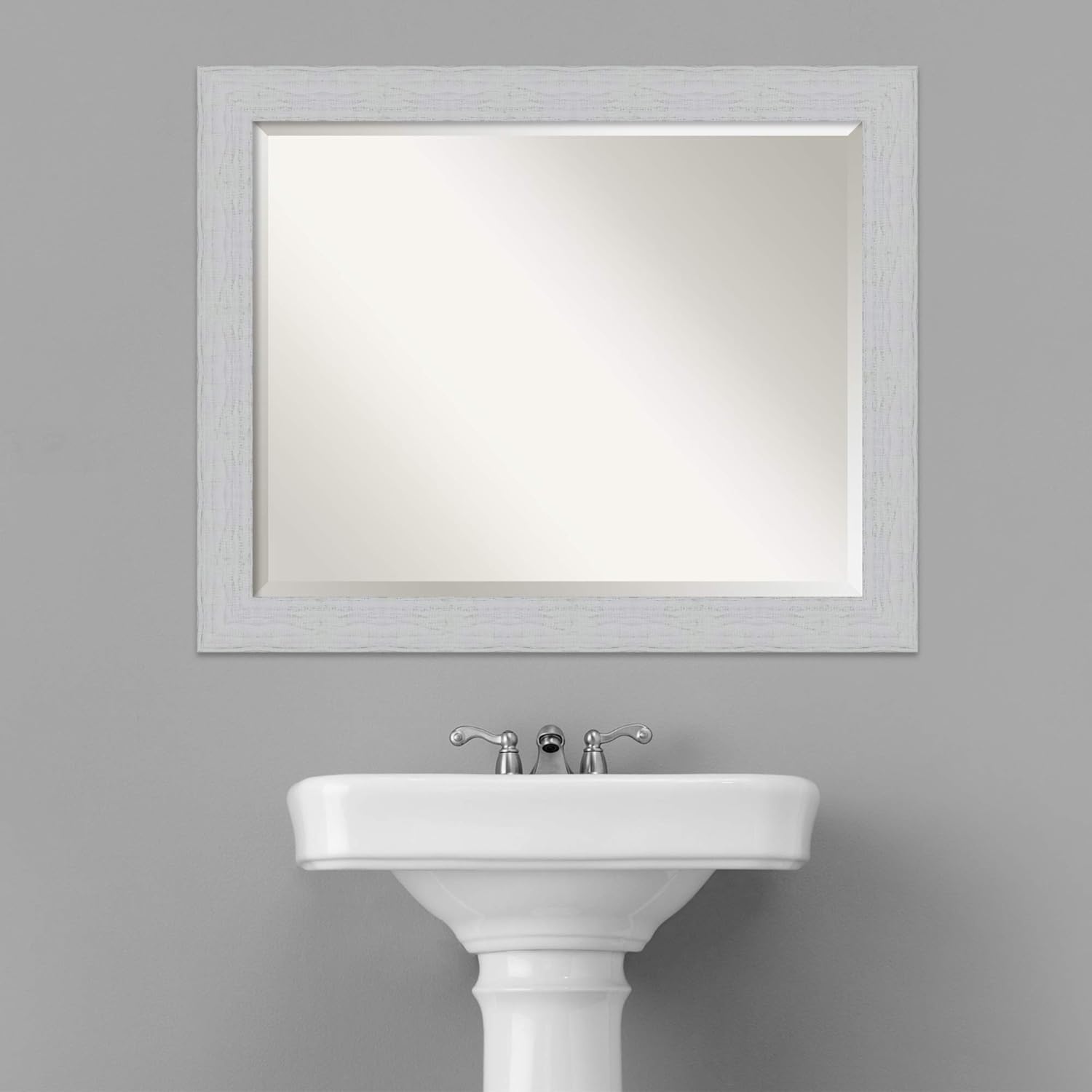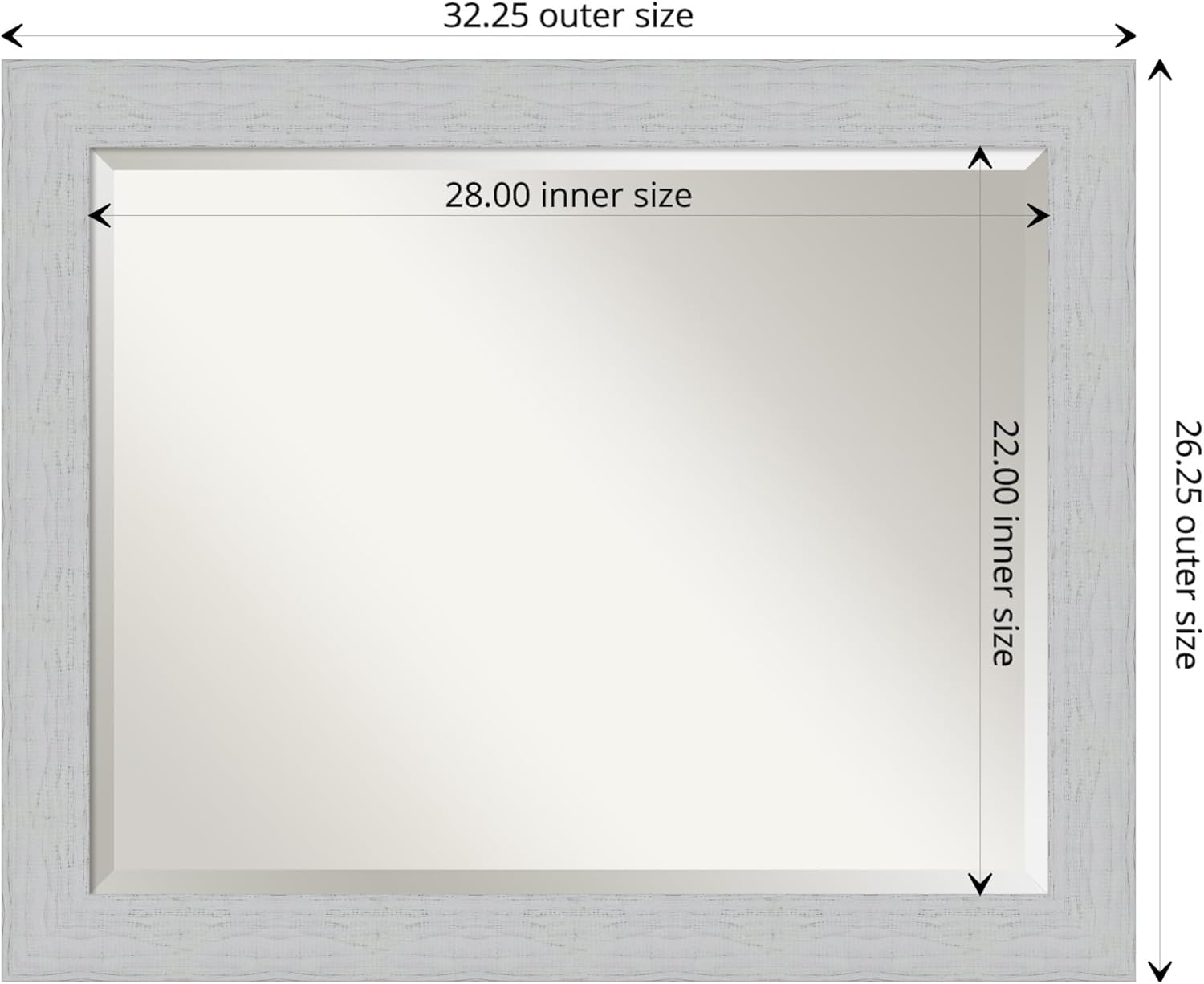 - MIRROR DETAILS: This mirror features premium glass for a clear, undistorted image and is finished with a beveled edge to give the glass a decorative touch. The overall size of this bathroom mirror measures exactly 32.25 x 26.25 inches, including the frame. Its reflective area measures 28 x 22 inches.