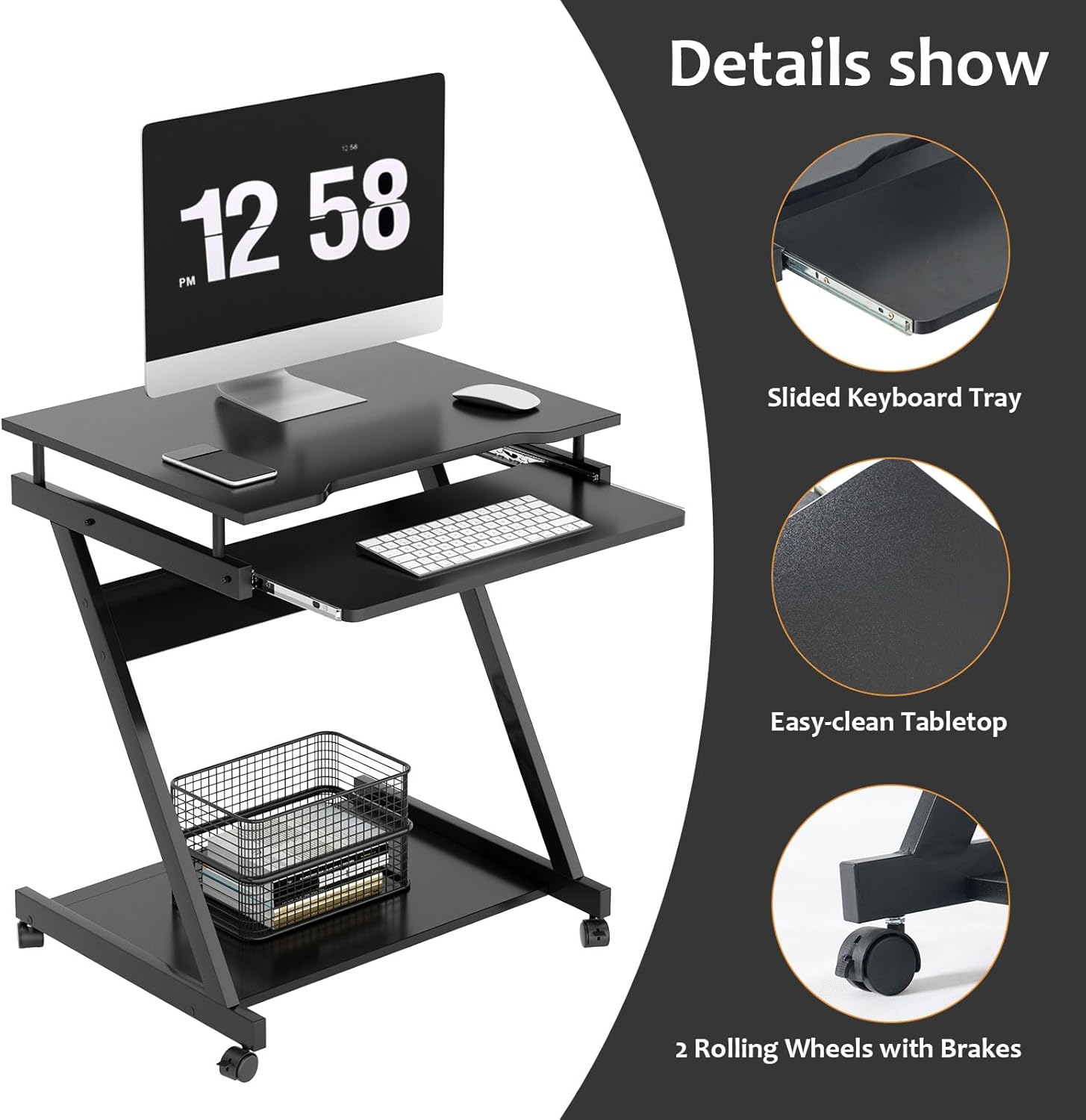 - 【Computer Desk Cart on Wheels】This Z shape computer desk cart comes with four smooth-rolling wheels, two of which can be locked, allowing you to move it easily and securely to any location you desire.