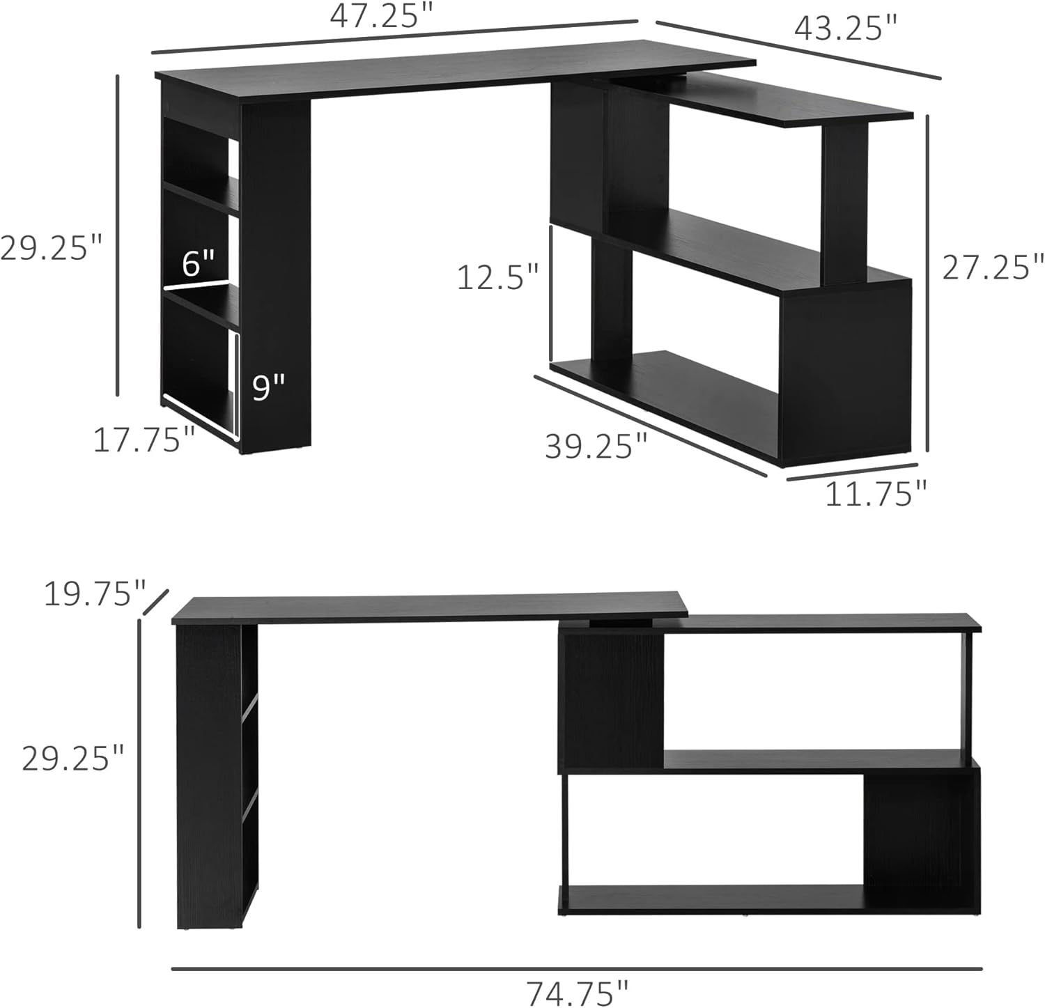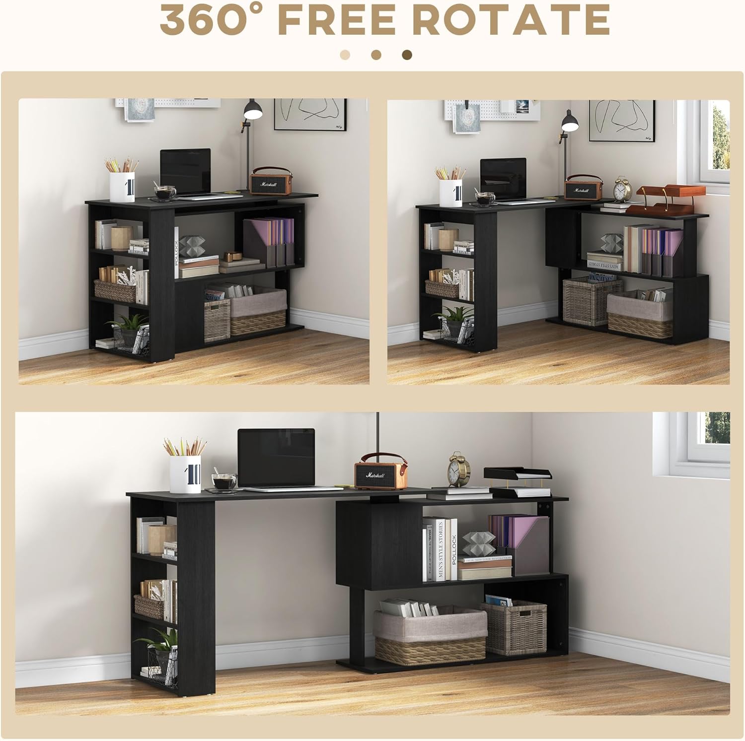 HOMCOM L Shaped Desk, Corner Computer Desk, 360 Degree Rotating Home Office Desk with Storage Shelves, Writing Table Workstation, Black