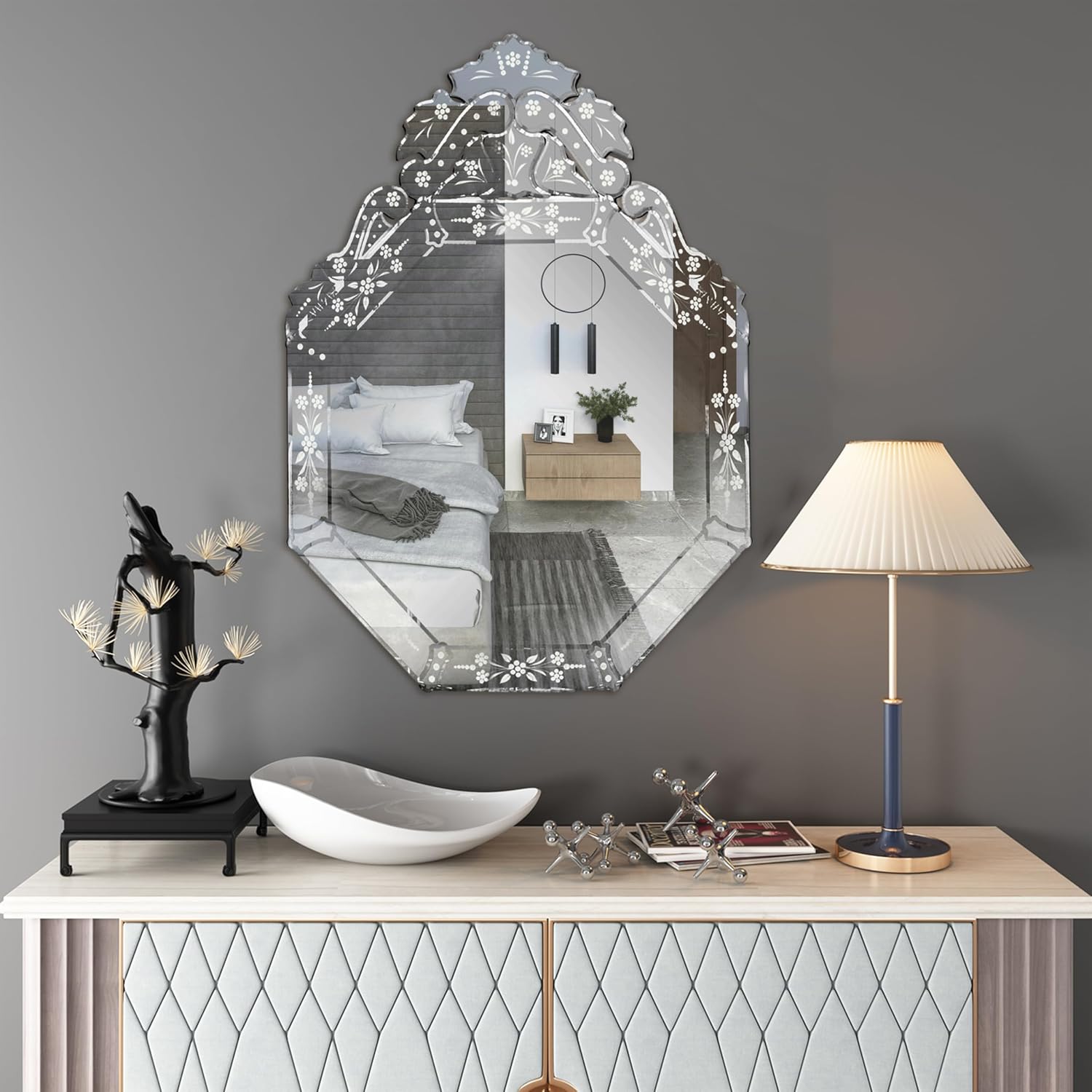 KOHROS Venetian Mirror with Top Crown Arch Floral Etched 32 x 24 Inch Octagonal Bathroom Mirror for Over Sink Frameless Beveled Edge Wall Mirror for Bathroom Vanity Entryway Bedroom