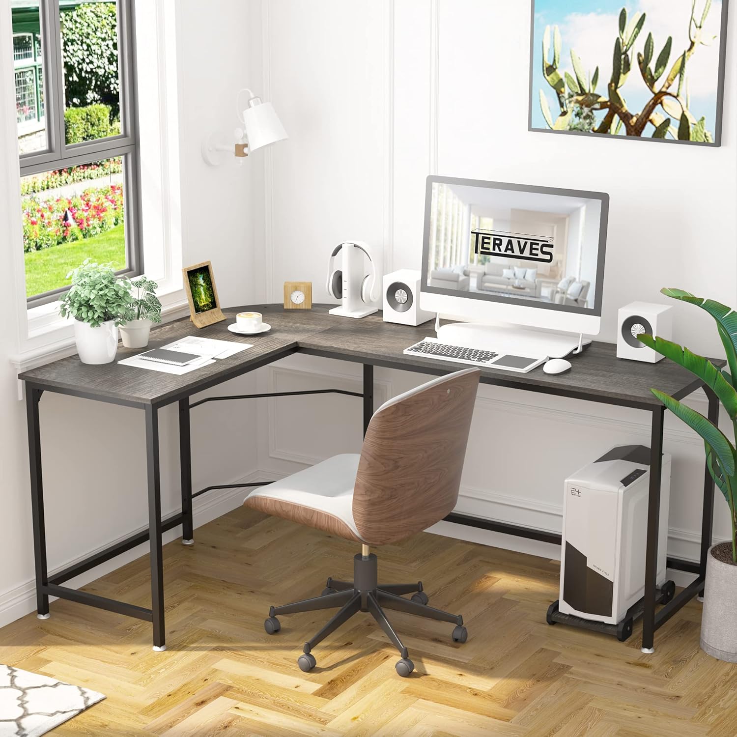 Teraves Reversible L Shaped Desk, 57.9" Gaming Computer Desk, Modern Corner Desks for Home Office Study, Space Saver Workstation Desk, Easy Assembly, Wooden