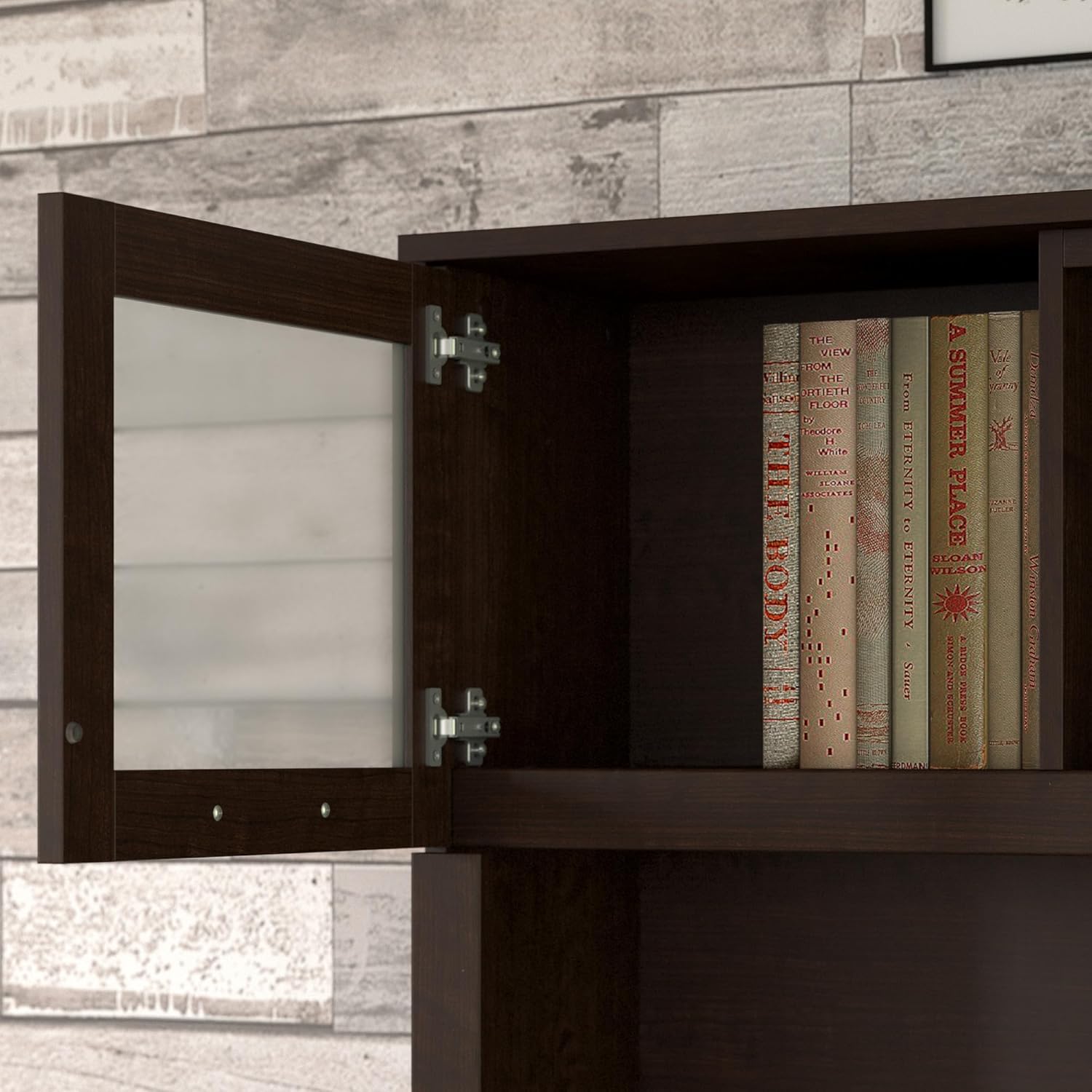 - Hutch attaches to the desktop and features two frosted glass doors for concealed storage