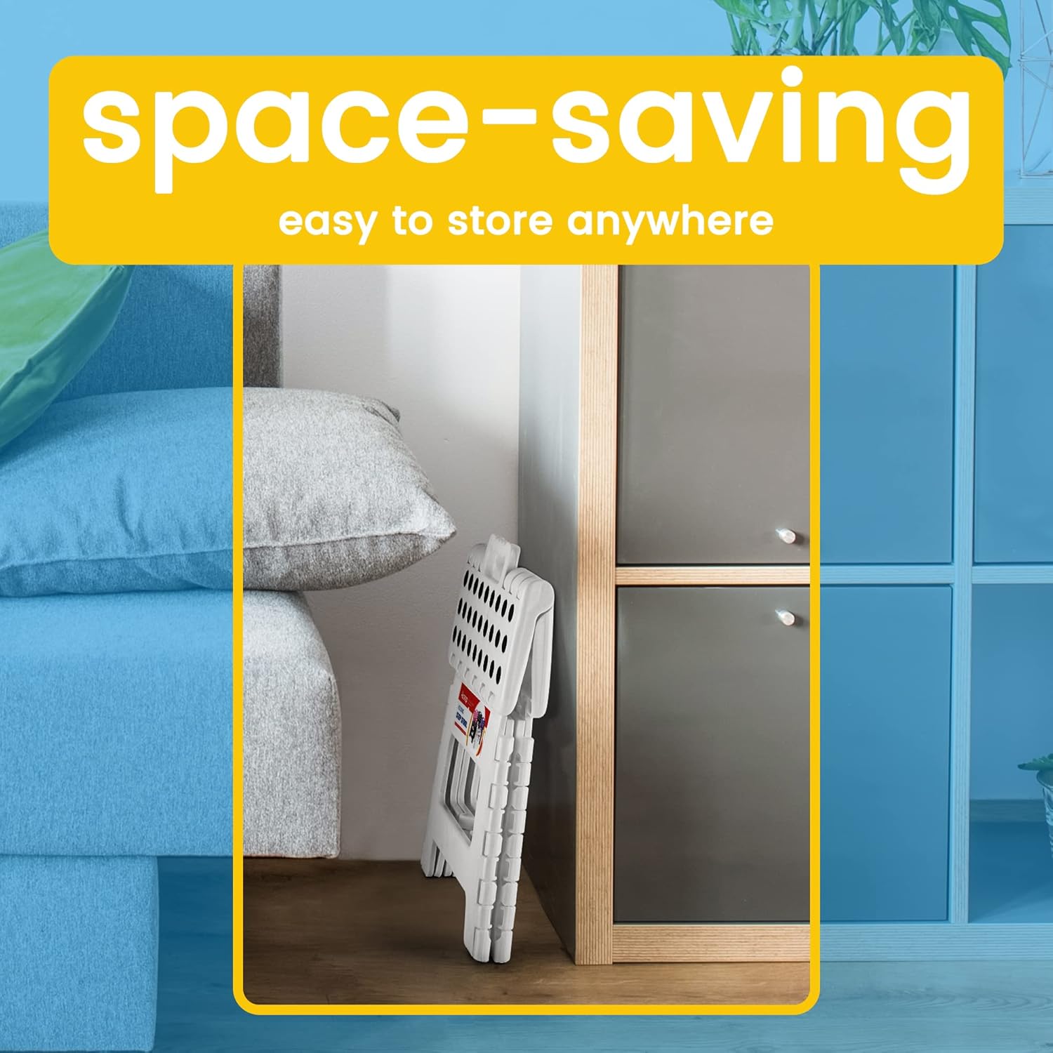 - Space Saving Foldable Stool -ACSTEP step stool saves your closet space more than 90% when it is folded up. It's quickly and easily folded for convenient storage so you can open with one flip of the hand. Also, you can hide them in a corner at home because it's so compact.