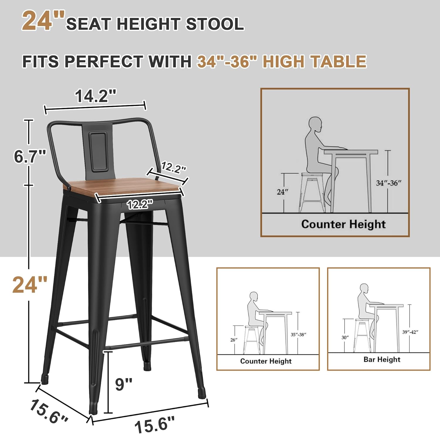 24 Inch Swivel Bar Stools Set of 4 with Backs Counter Height Industrial Metal Barstools Island Bar Chairs for Home Kitchen Dining Room (Swivel 24 inch,Matte Black Wooden)