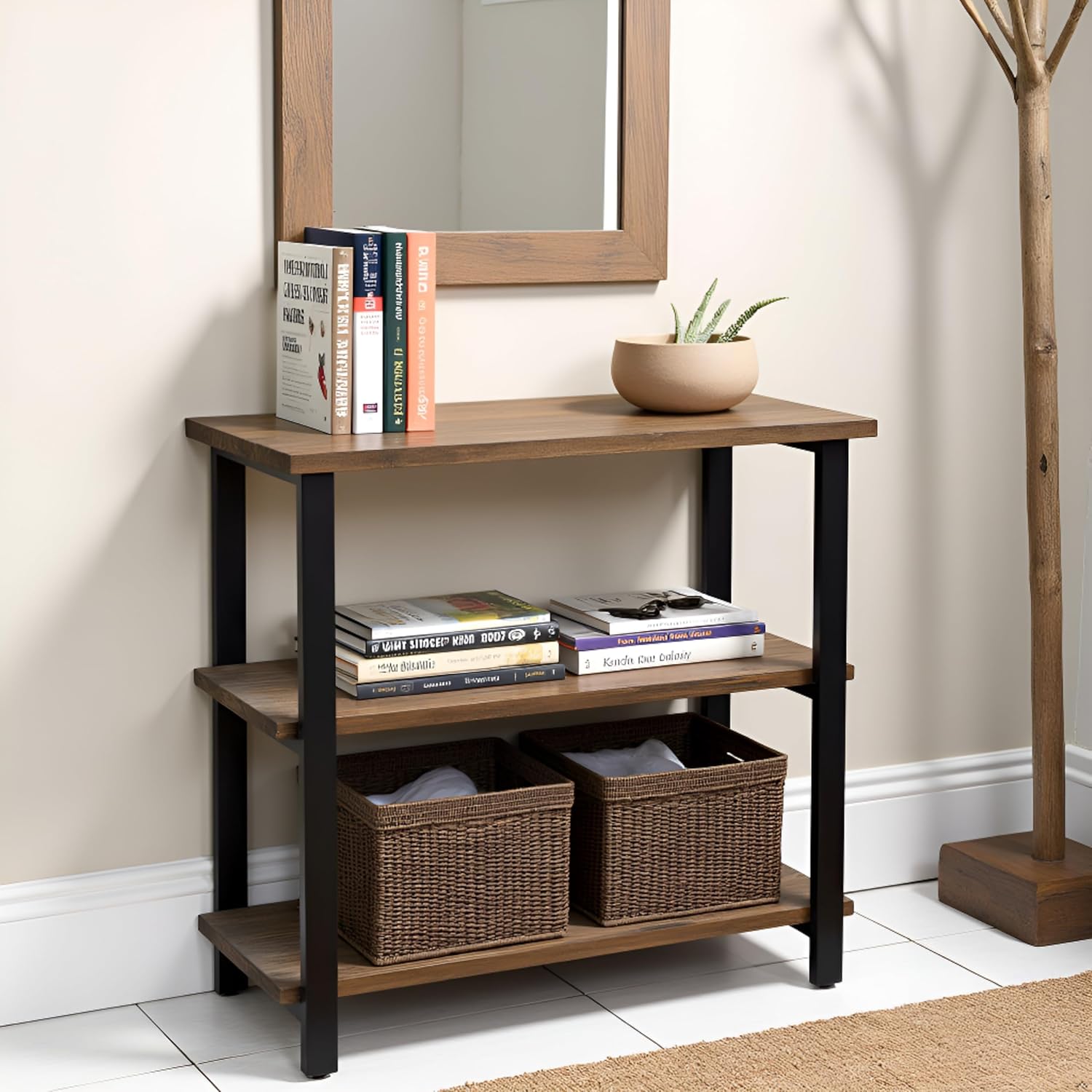 - 3-TIER BOOKCASE – Bring character and warmth into your home with the Pomona 31" Tall 3-Tier Bookcase. Featuring a reclaimed wood look with natural variations in grain, knots, and texture, paired with a sleek black metal frame, this under-window bookcase blends rustic farmhouse and industrial style for a timeless accent in any space.