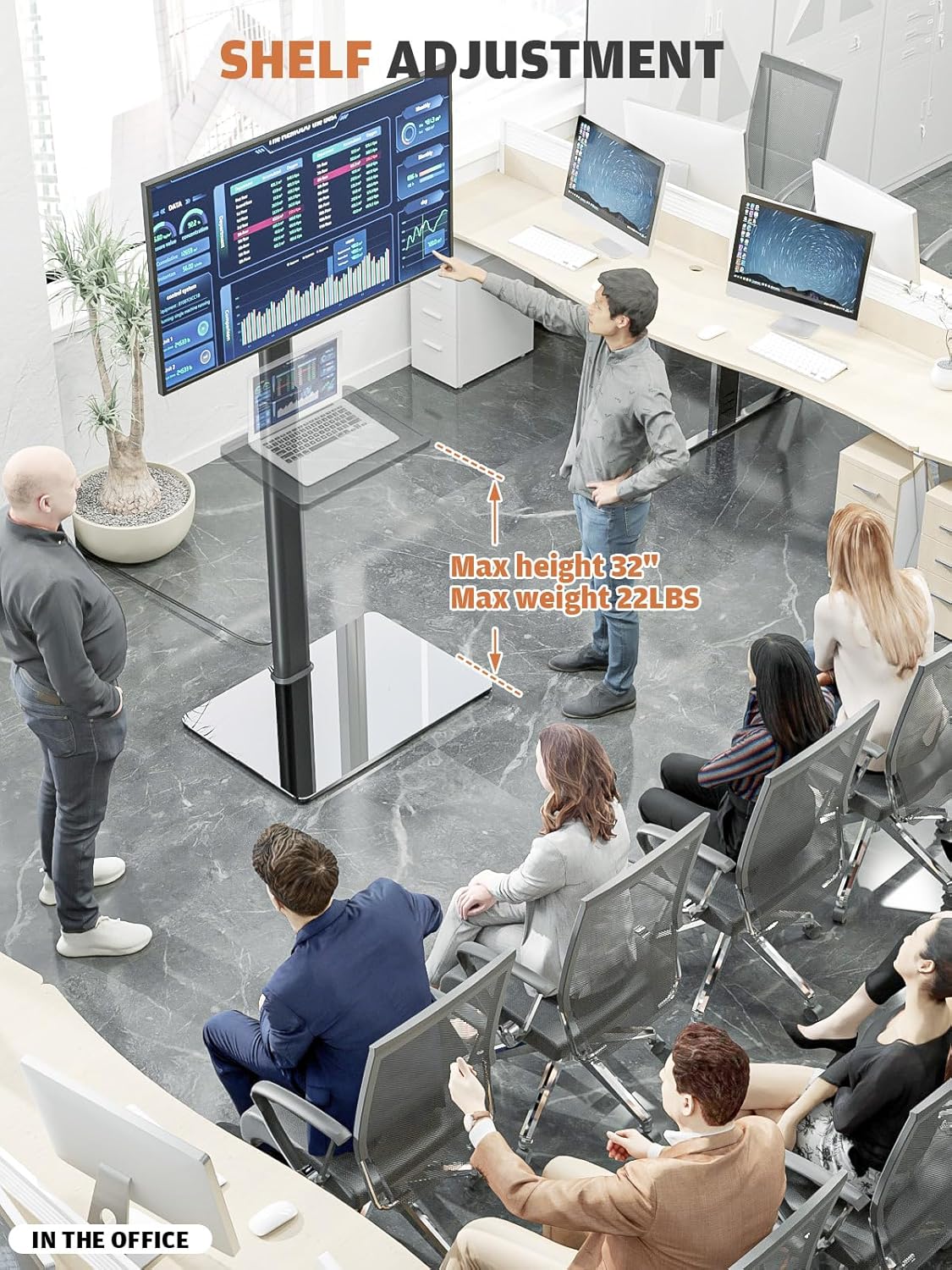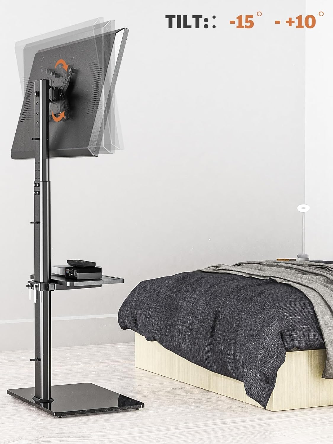- SMART DESIGN ☞ This smart floor TV stand with mount comes with 10mm solid tempered glass base that connects to a solid steel pillar which provides stable support for your TV that creates a modern look for your audio video equipment, it can hold up to 99lbs,besides the top shelf have the heat dissipation function to put some small device,this is our unique design