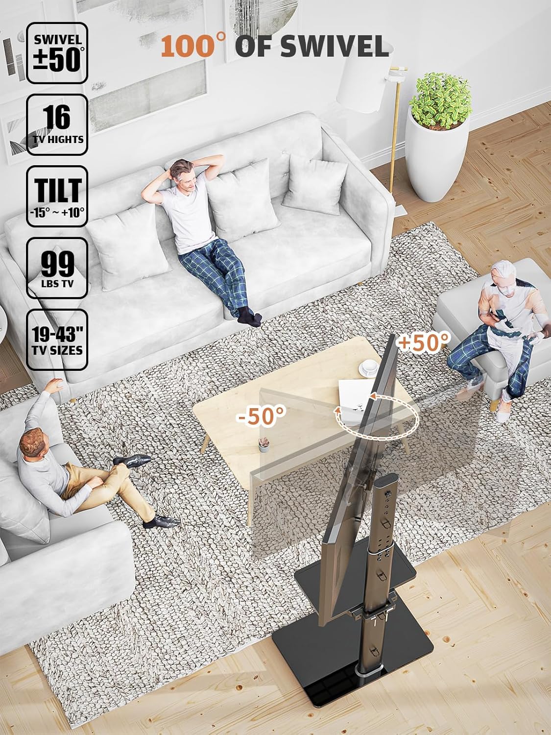 - MULTIFUNCTIONAL FLOOR TV STAND ☞ My functional TV mount have 8 level height adjustment in order to choose your best space, besides -50 to +50 degree swivel mount can choose the best viewing to catch TV entertainment, Tilt function can expand the viewing angle in order to enjoy your view effection