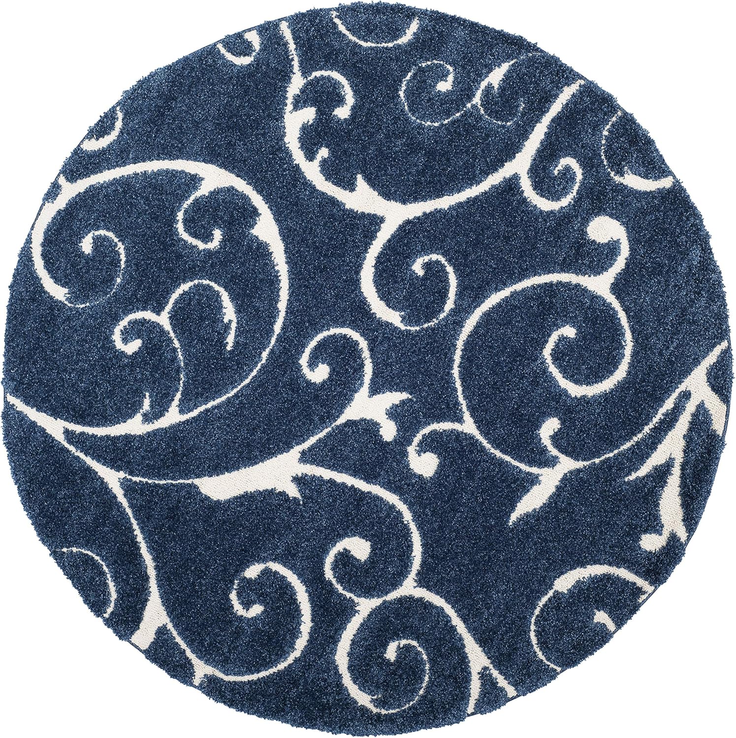 SAFAVIEH Florida Shag Collection 5' Round Dark Blue/Cream SG455 Scrolling Vine Graceful Swirl Textured Non-Shedding Living Room Bedroom Dining Room Entryway Plush 1.2-inch Thick Area Rug