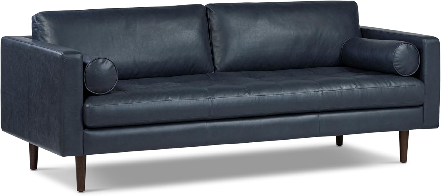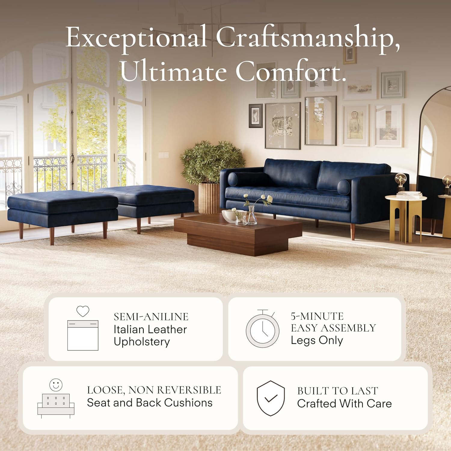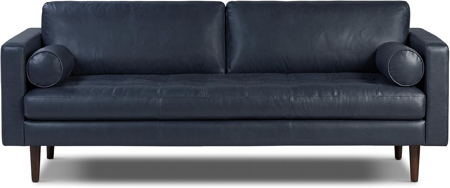 - Quality First Because Quality Lasts: Our full-grain pure-aniline Italian leather sofa is designed with your comfort in mind, featuring a feather-down topper on seating surfaces, webbing support, and two loose bolsters. Its solid wood legs with a walnut finish complement the midnight blue, making it an ideal office sofa or living room sofa.