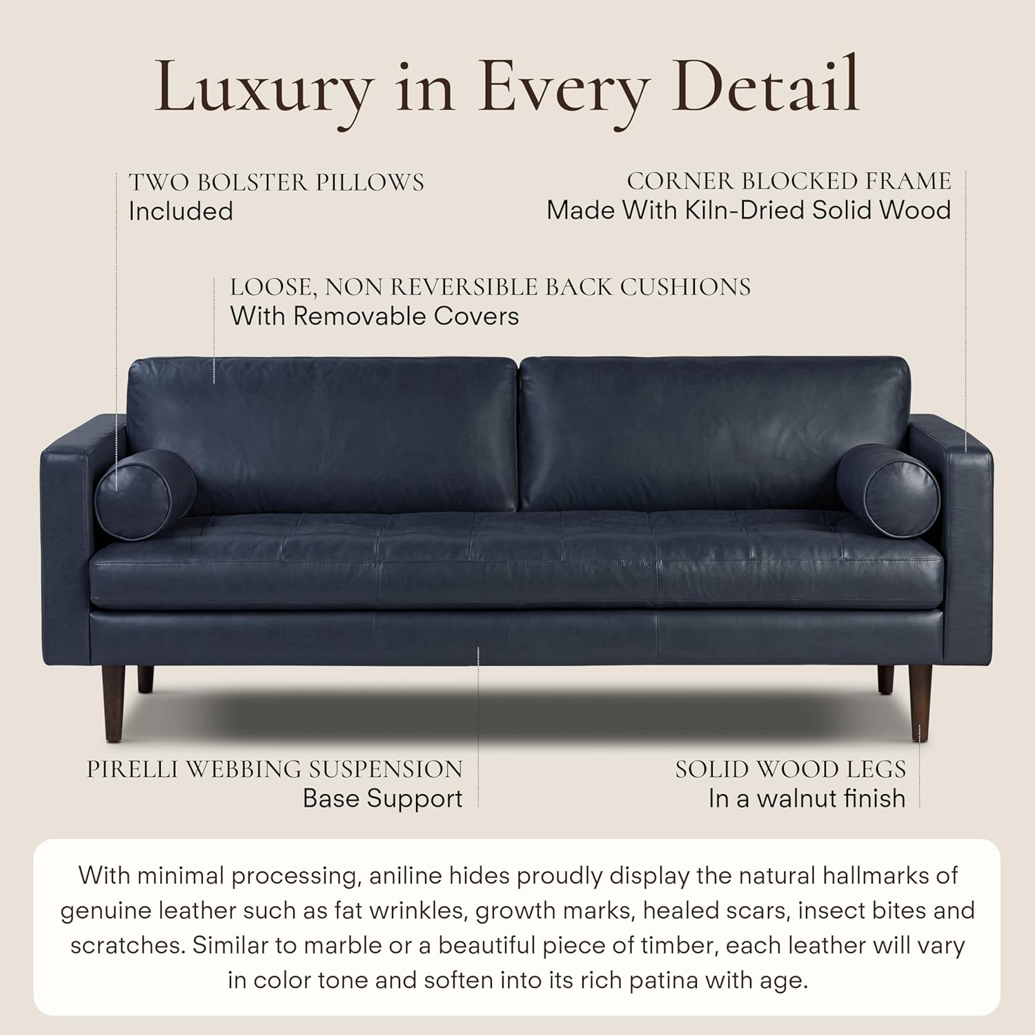 Poly & Bark Napa Leather Couch - 88.5-Inch Office Sofa with 2 Bolsters - Full-Grain Leather Sofa for Living Room with Feather-Down Topper - Living Room Couch - Vintage Italian Leather in Midnight Blue