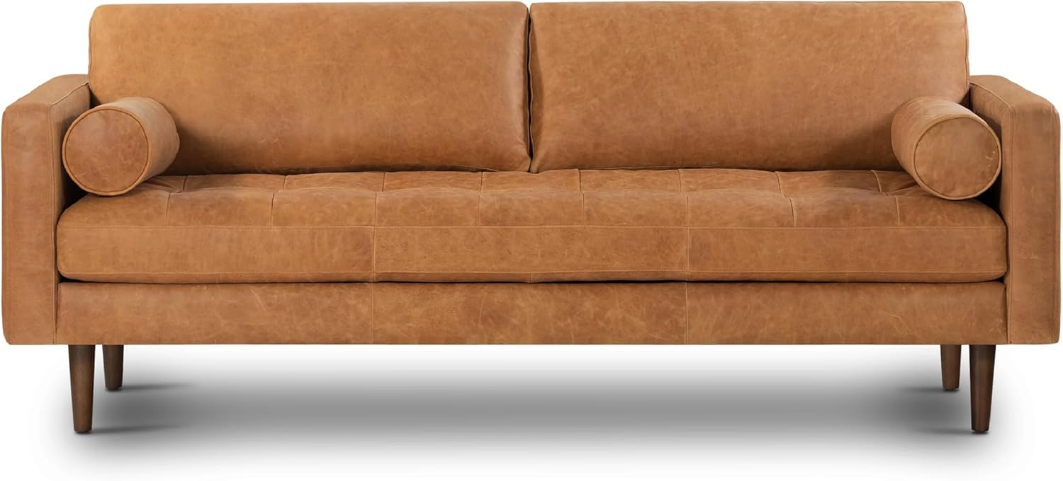- Quality First Because Quality Lasts: Our full-grain pure-aniline Italian leather sofa is designed with your comfort in mind, featuring a feather-down topper on seating surfaces, webbing support, and two loose bolsters. Its solid wood legs with a walnut finish complement the cognac tan, making it an ideal office sofa or living room sofa.